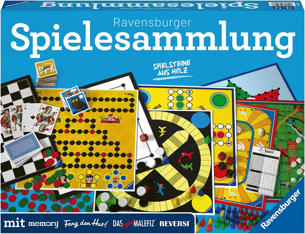 - Diese hochwertige und langlebige Spielesammlung bietet Original Ravensburger Qualität mit Spielsteinen aus Holz und stabiler Pappe.