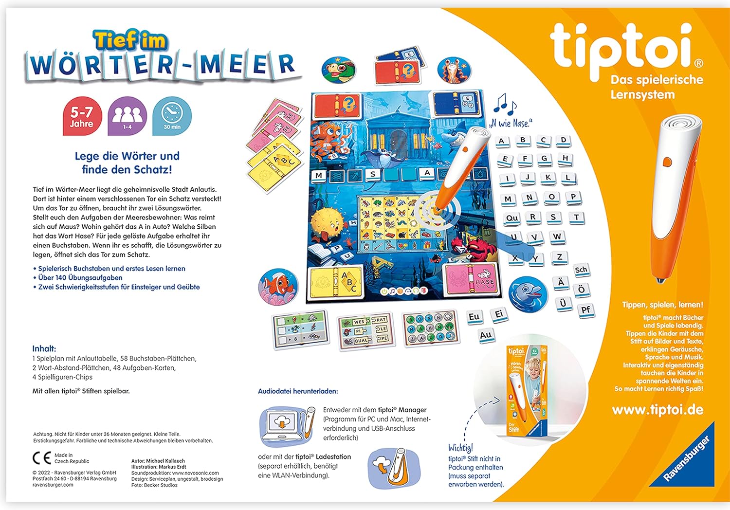 - Das Spiel "Tief im Wörter-Meer" von 5 bis 7 Jahren für 1 bis 4 Spieler. 2 verschiedene Schwierigkeitsstufen mit Aufgaben für Einsteiger und Geübte bringen Kindern spielerisch Buchstaben und Wörter bei. tiptoi motiviert, liest mit und gibt