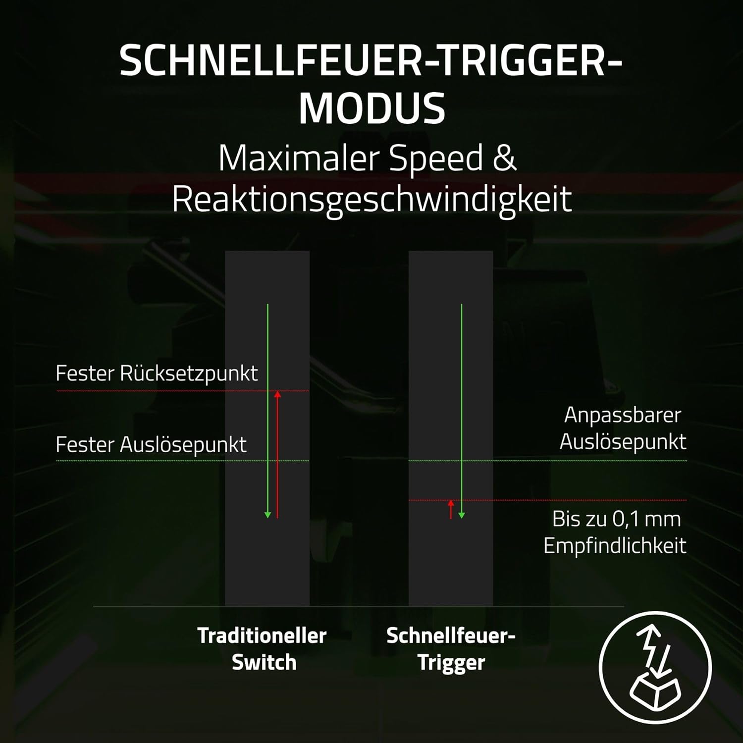 - Analoge optische Schalter von Razer der 2. Generation mit Schnellfeuer-Trigger und anpassbarem Auslösepunkt. Gönn dir maximale Präzision und minimale Reaktionszeiten mit unseren modernsten Switches, inklusive Schnellfeuer-Trigger für ultra schnell