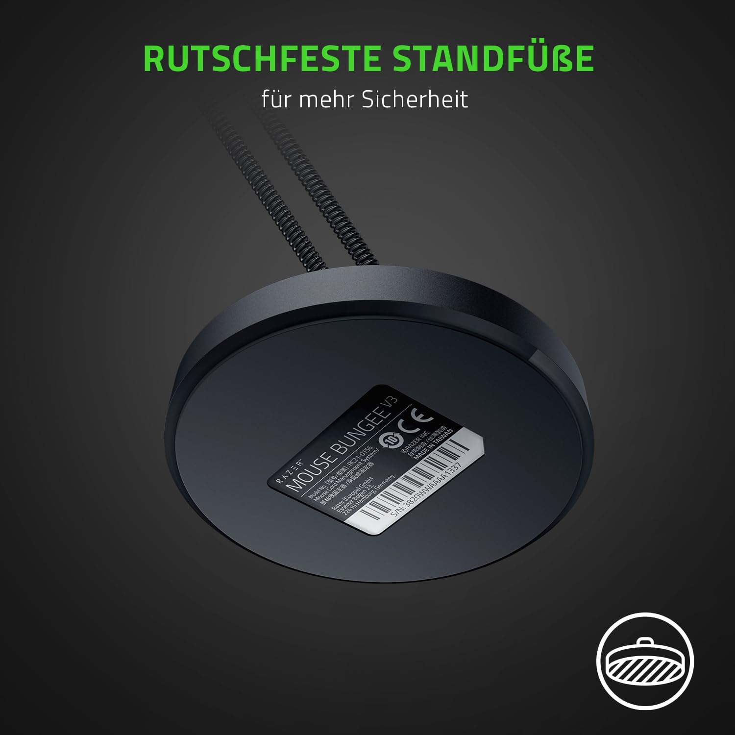 - Beschwerte Basis: Das Razer Mouse Bungee V3 verfügt über eine beschwerte Basis, die verhindert, dass es umkippt – deine sichere Basis, auch wenn's beim Gaming mal besonders heiss hergehen sollte