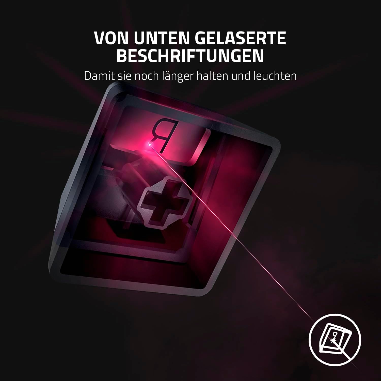 - Von unten gelaserte Beschriftungen: Anders als bei normalen Tastenkappen, die von oben gelasert werden, sorgt diese Methode dafür, dass sich die Beschriftungen nicht abnutzen und noch heller leuchten, da die Schicht zwischen Tastenkappe und Lichtquelle