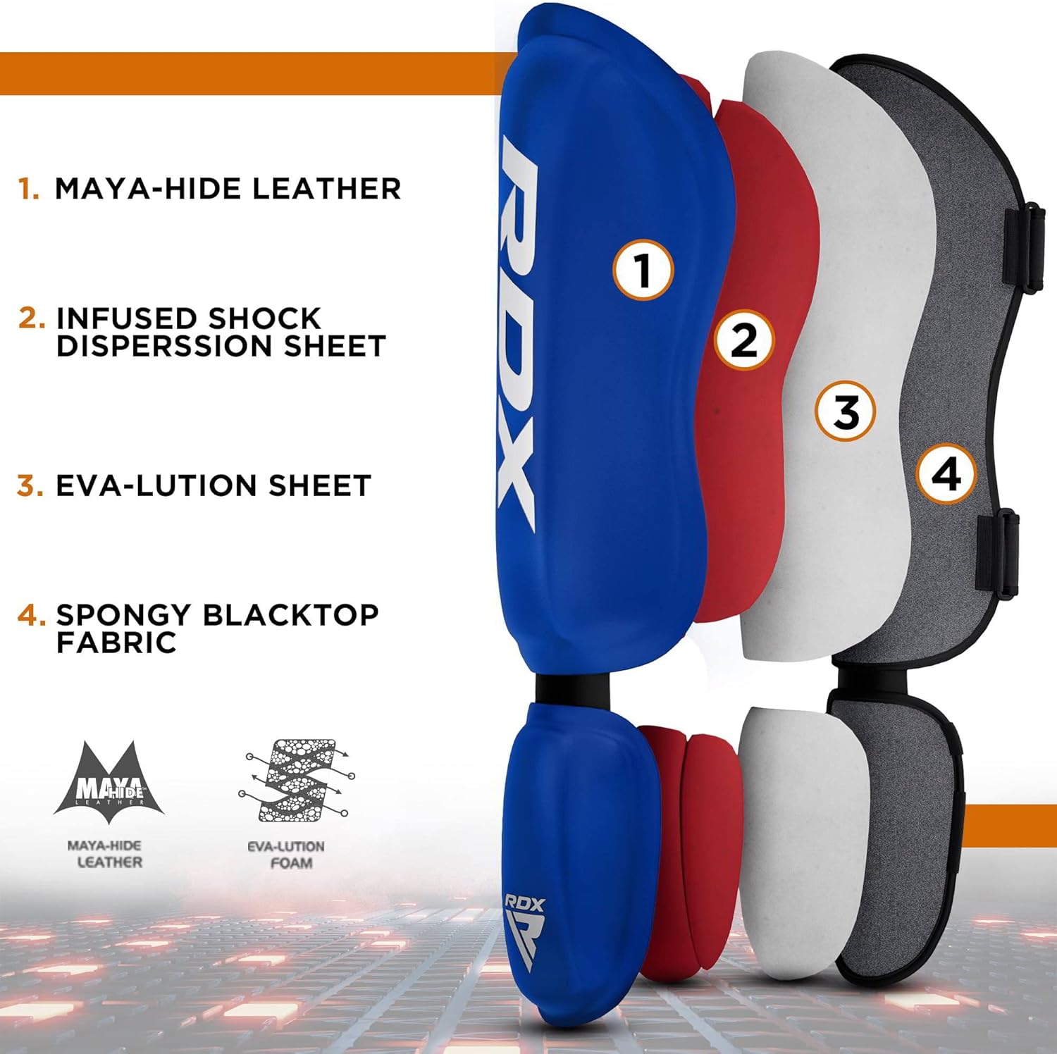 • Die RDX Schienbeinschoner sind aus leichtem Maya Hide Leder und einem Nylon Innenmaterial gefertigt, das für integrierte Haltbarkeit und Rissfestigkeit sorgt. Perfekt unterstützt dich beim Muay Thai, Kickboxen, MMA, BJJ, Karate und mehr.