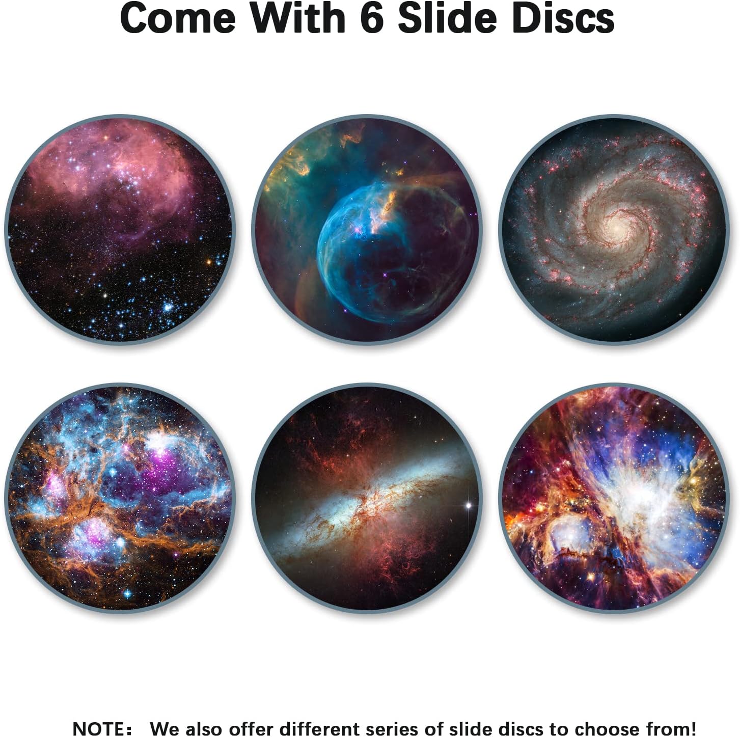 • Lieferumfang: 6-Dias ohne Projektor, einschliesslich Grosser Magellan, Orionnebel, Blasennebel, Whirlpool Galaxien, Hummernebel, Zigarrengalaxy. (Hinweis: Der Projektor ist nicht im Preis inbegriffen!)