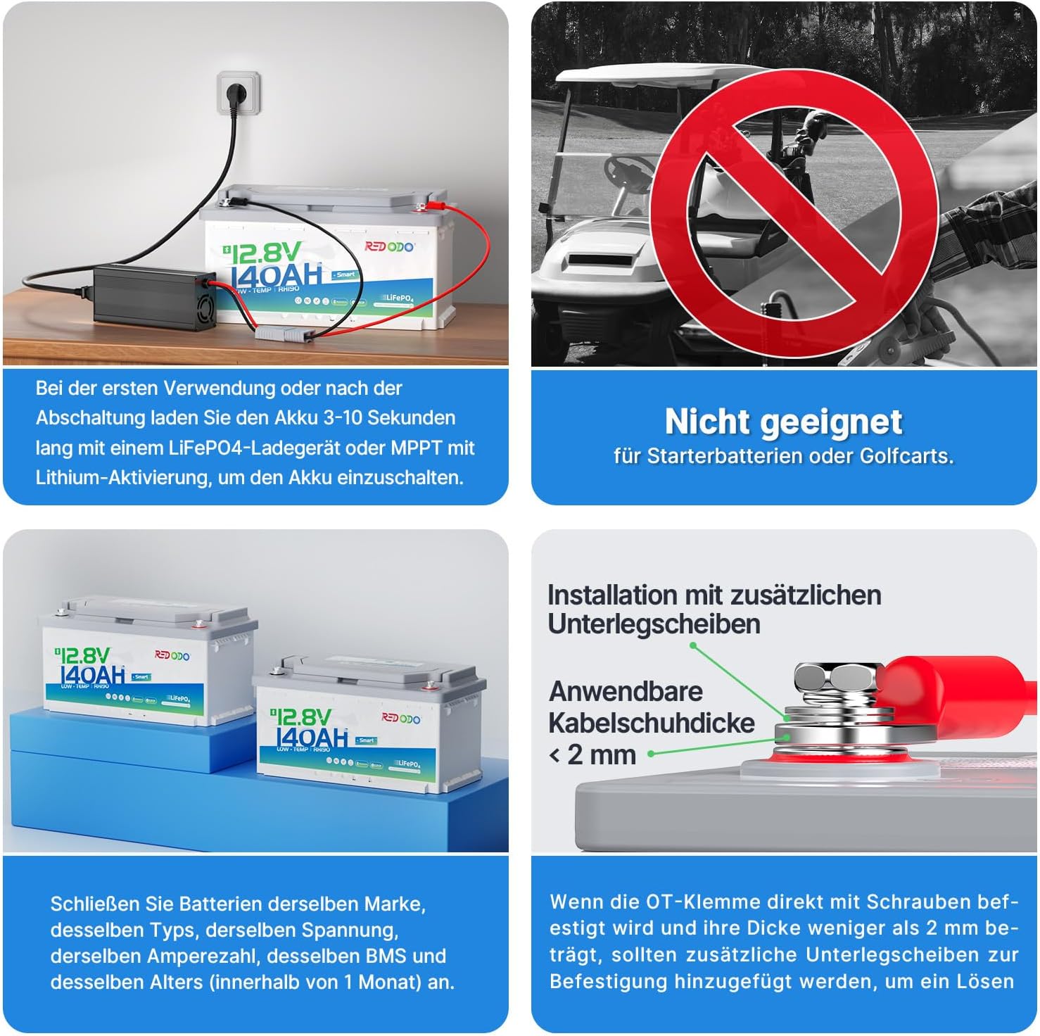 - 【Bluetooth 5.0】: Redodo App ermöglicht die Anzeige des Batteriestatus, einschliesslich Lade-, Entlade- und Standby-Modus, sowie SOC, Spannung, Strom, Leistung und Batterietemperatur. Sie können auch die Abschaltung der Batterie und den