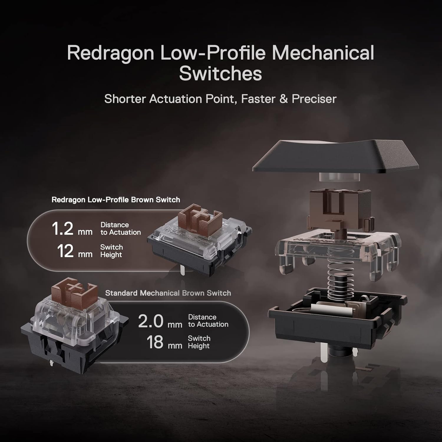 - 30% dünner: Das gesamte Design der Tastatur ist auf ein niedriges Profil ausgelegt, angefangen bei der Unterseite, über die mittleren, flachen braunen Schalter (min. Betätigungskraft: 30 g) bis hin zu den oberen Tastenkappen, um den Abstand zur