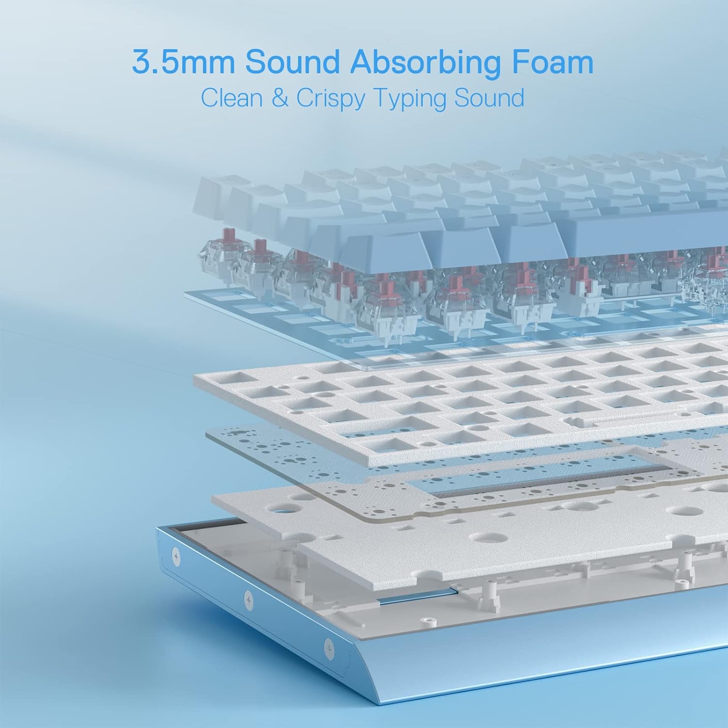 - Schallabsorbierender Schaumstoff - Der 3,5 mm dicke, schallabsorbierende Schaumstoff zwischen der Leiterplatte und der Positionierungsplatte reduziert effektiv die von der Schrapnellfeder erzeugten Geräusche, verbessert die Klangleistung der Tastatur
