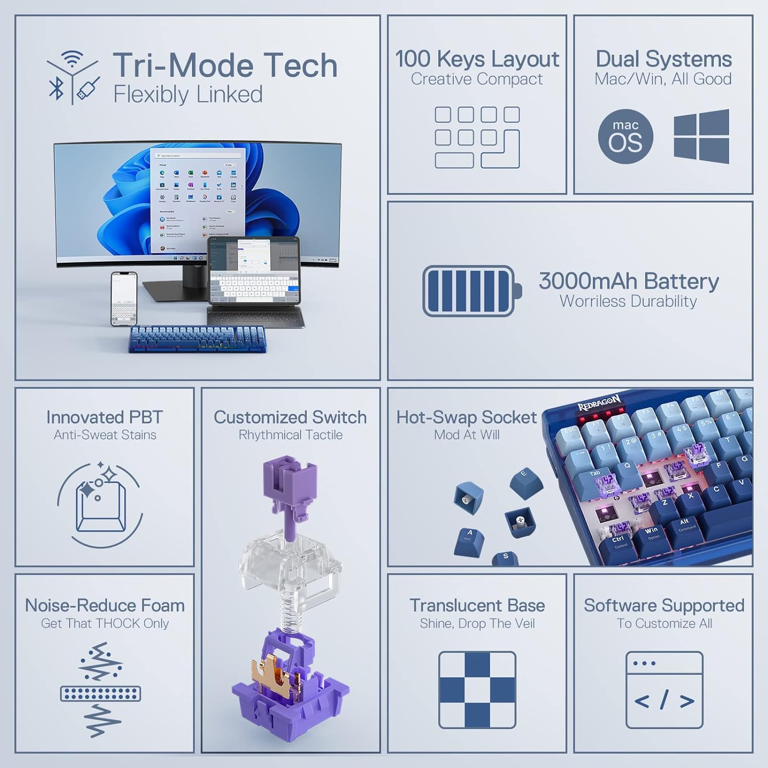 - 3-Mode-Verbindung - Ausgestattet mit Redragons fortschrittlicher Tri-Mode-Verbindungstechnologie, USB-C kabelgebunden, BT 3.0/5.0 & 2.4Ghz Wireless-Modi, die die Benutzererfahrung in allen Bereichen auf eine andere Ebene heben.