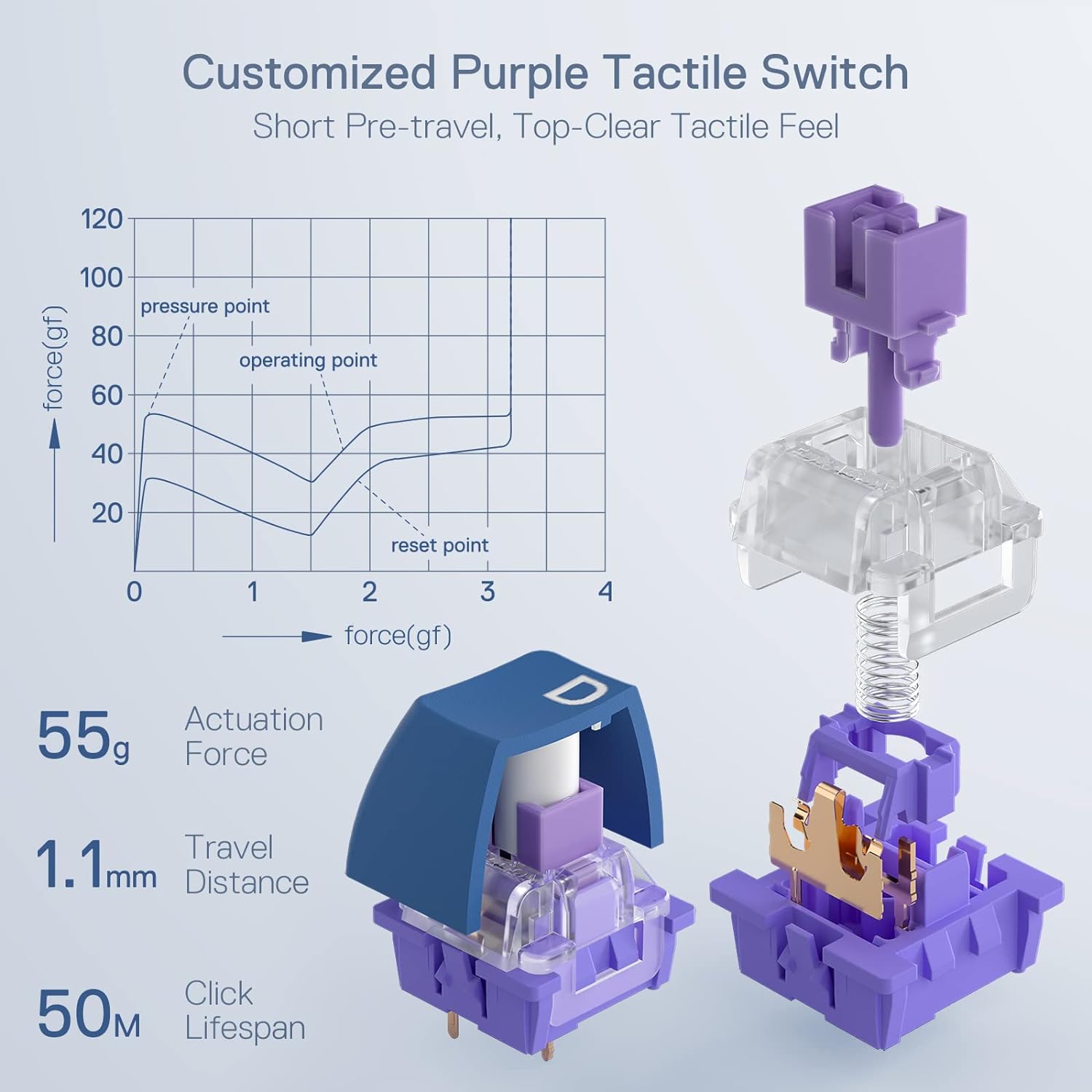 - Custom Purple Switches - Bewaffnet mit dem brandneuen Custom Switch aus Redragons eigener Entwicklung und Produktion, 55g Betätigungskraft + 1,1mm Pretravel Abstand bietet ein klares und starkes taktiles Gefühl mit zufriedenstellendem THOCK.