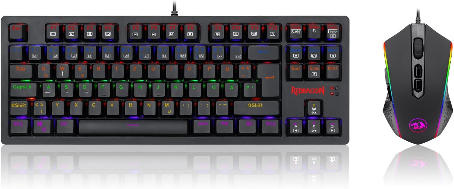 - Gaming Tastatur und Maus Set mechanische Tastatur mit Rainbow Hintergrundbeleuchtung plus Gaming Maus mit RGB Hintergrundbeleuchtung. Alle Tastatur Tasten sind konfliktfrei (n-Key Rollover)