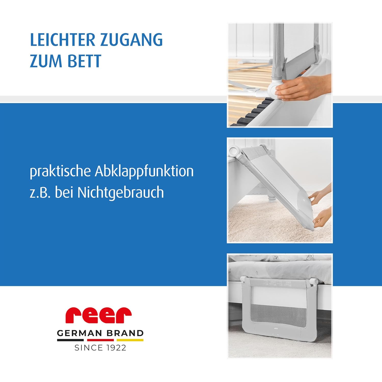 - Integrierte Abklappfunktion: Klappen Sie das Gitter nach vorn, wenn Sie es nicht benötigen oder Ihr Kind aus dem Bett heben wollen. Funktioniert nicht bei versenkten Lattenrosten