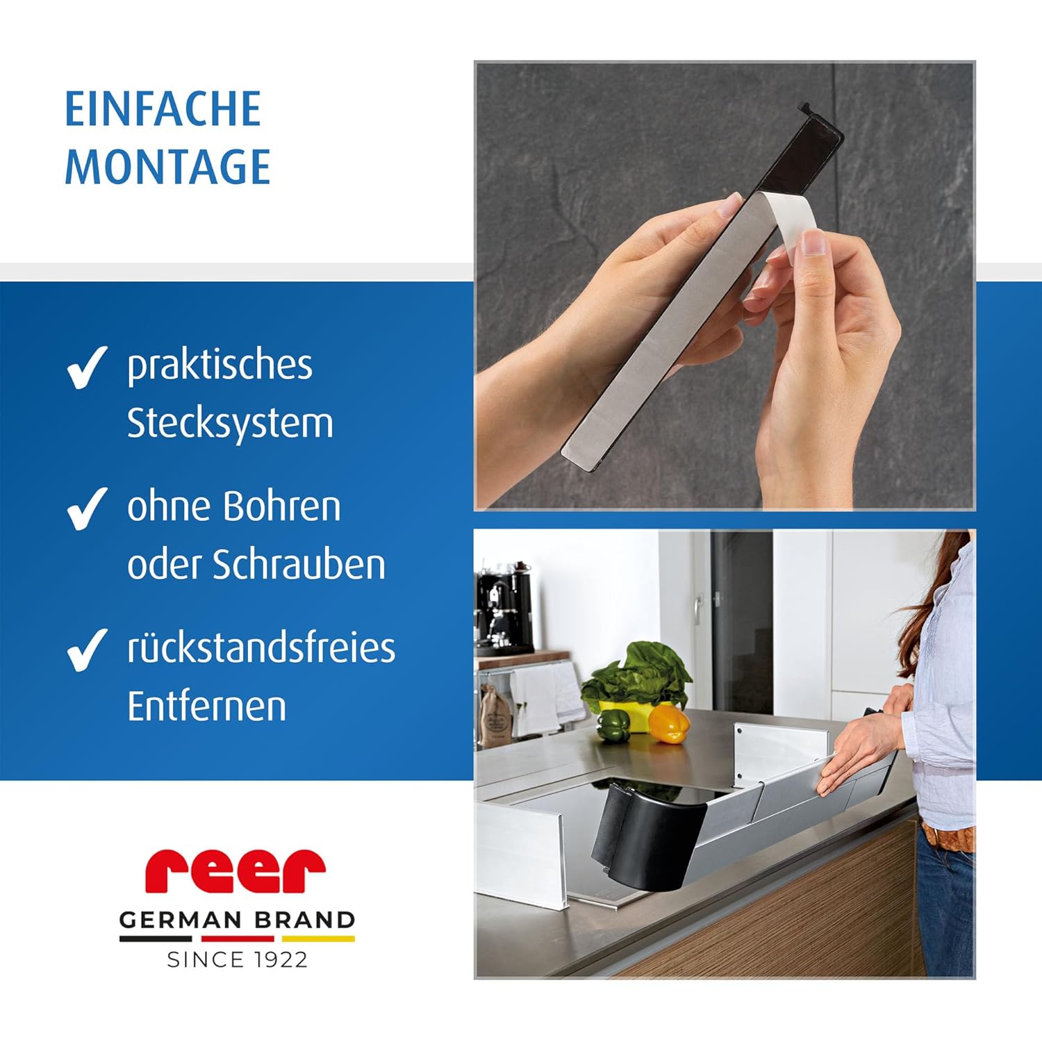 • Kein Fassen auf die heisse Herdplatte und Herunterziehen von heissen Töpfen. Mit Spezialklebeband werden die Halteleisten für den Herdschutz direkt auf der Küchenplatte angebracht, sodass er unabhängig von Oberflächenmaterial und Plattenstärken auf