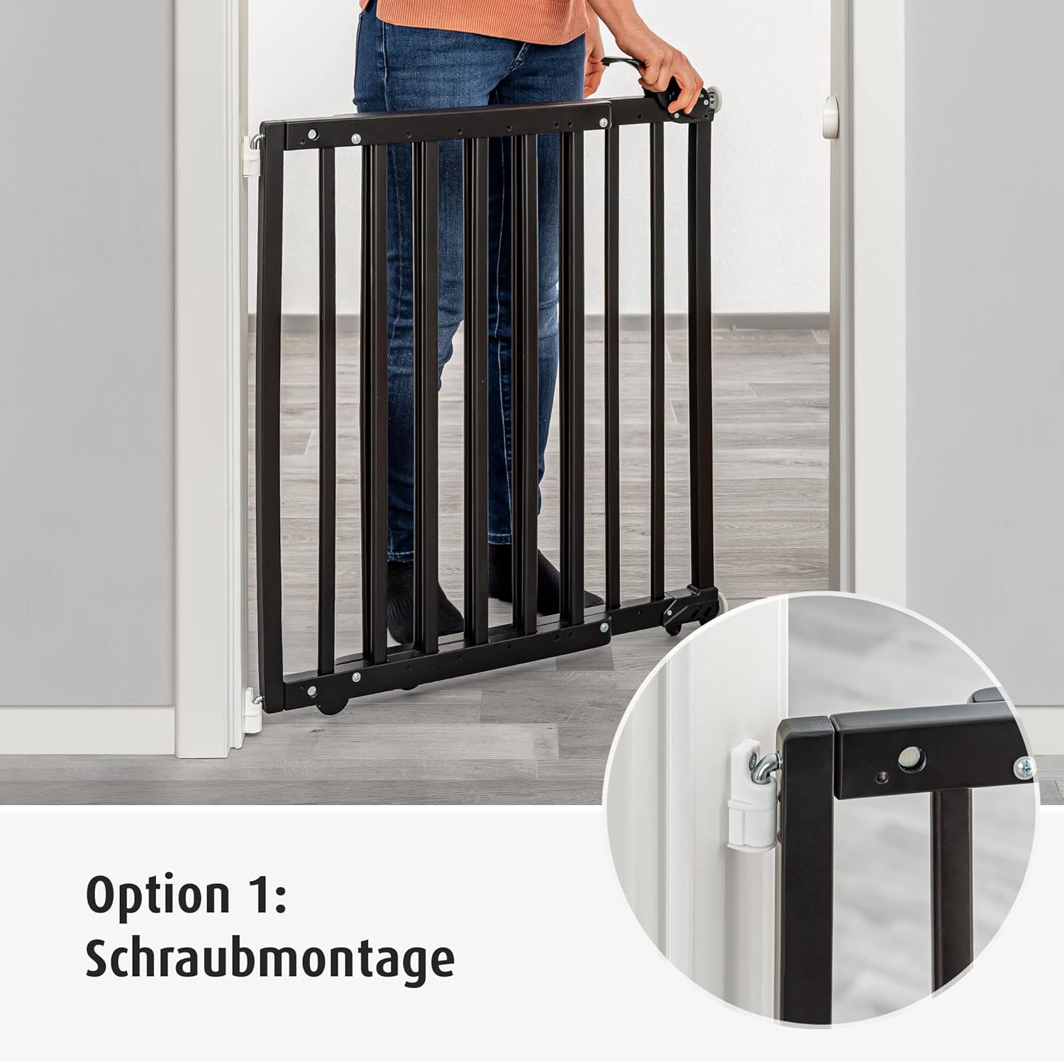 - Das Absperrgitter lässt sich bei Schraubmontage bequem mit einer Hand öffnen und ist dank zwei Bewegungen zum Öffnen trotzdem kindersicher.