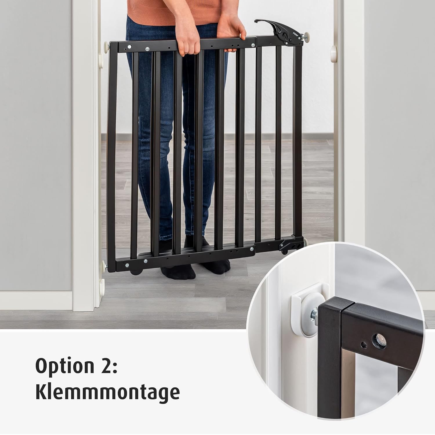 - Zwei Montagemöglichkeiten: fester Halt durch Schraubmontage (einfaches Öffnen durch Schwenktür) oder geklemmt ohne Schrauben und Bohren (Öffnen durch Entnahme des Gitters; ideal für eine temporäre Nutzung z.B. bei den Grosseltern)