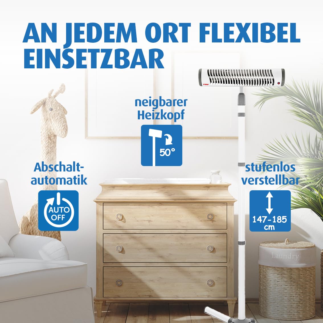 - Der Standfuss des Heizstrahlers ist modular, deshalb lässt er sich besonders dicht am Wickeltisch positionieren, die Kipp-Abschaltung gibt Ihnen Sicherheit
