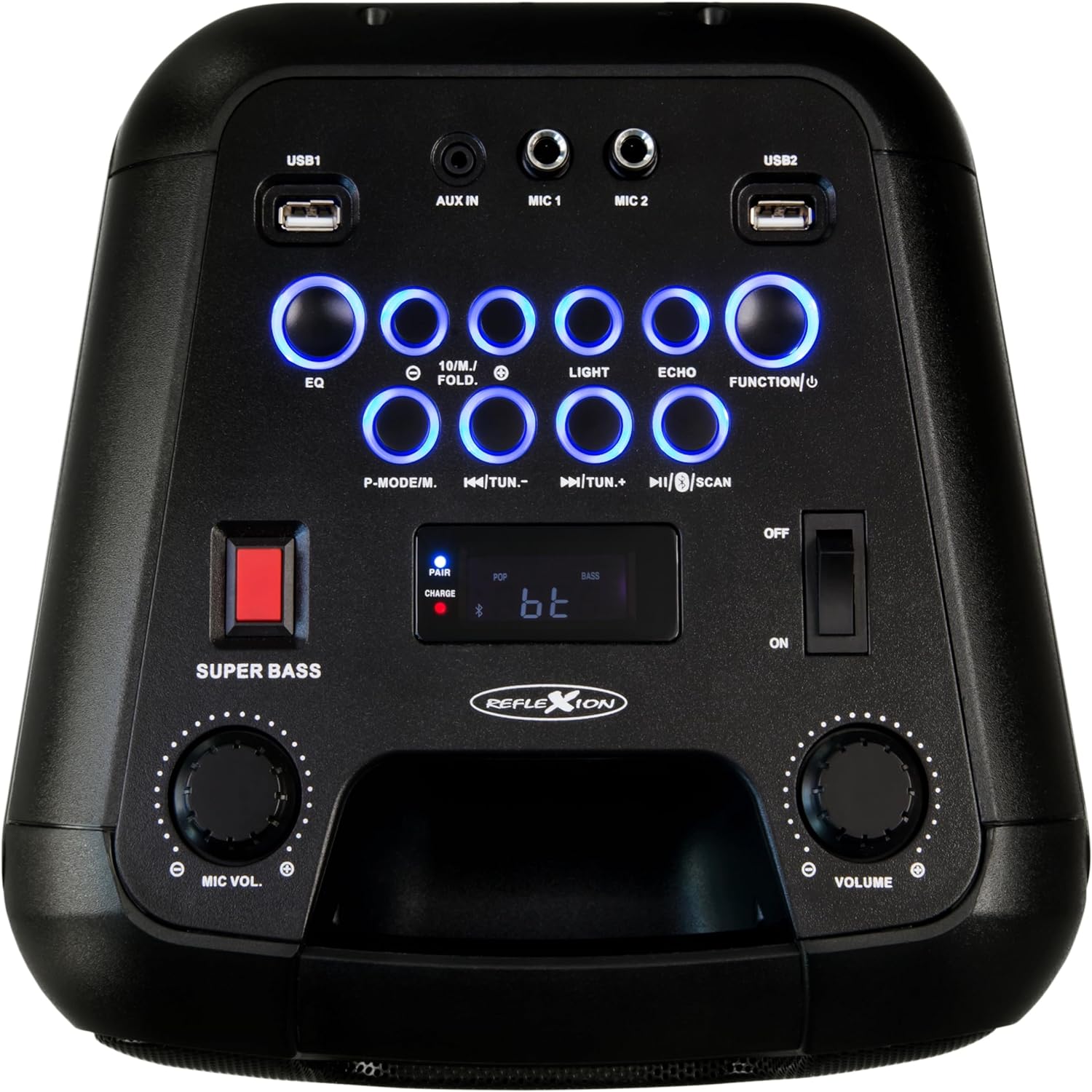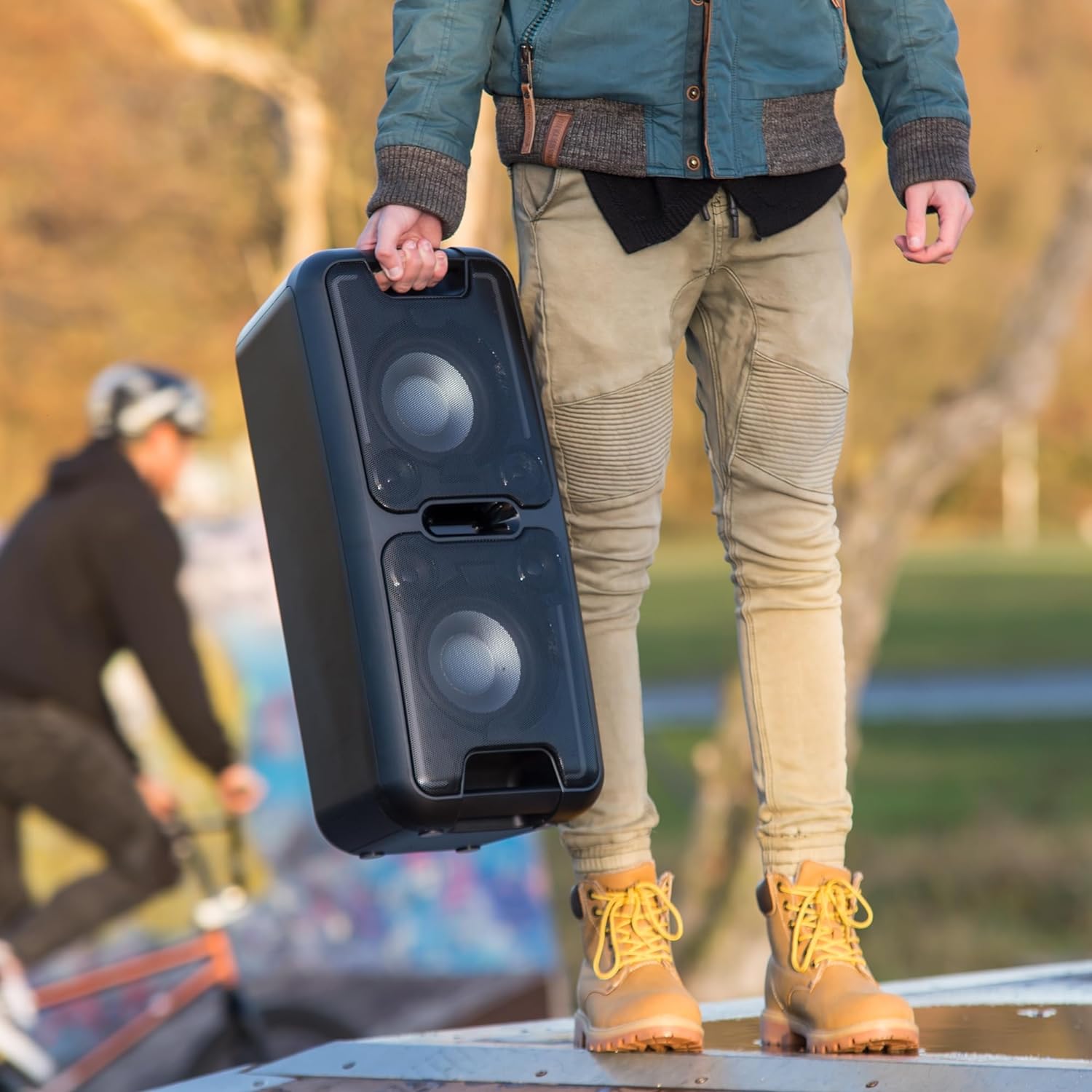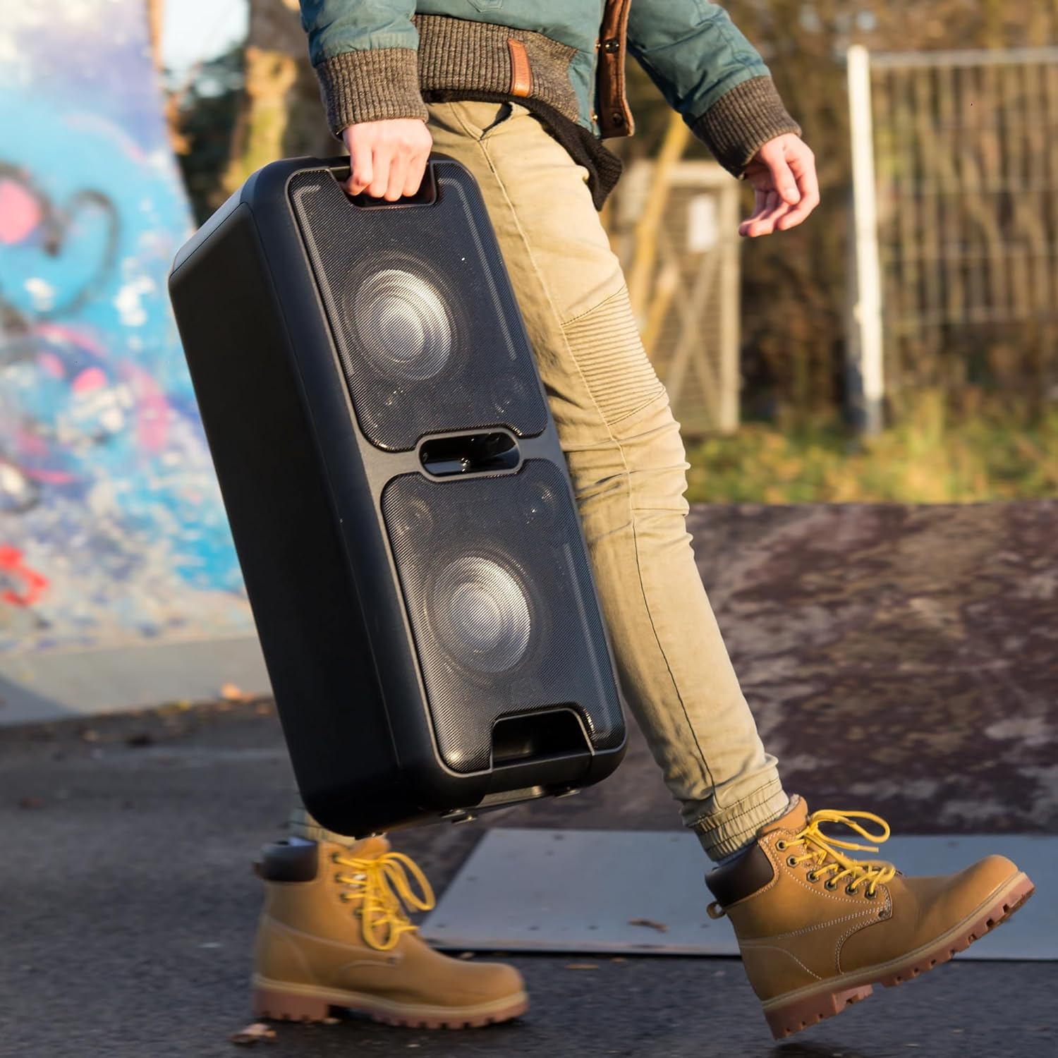 - Mobile Anlage DJ-Anlage mit eingebautem Hochleistungs-Akku, Wiedergabezeit bis zu 4 Stunden. Leicht zu transportieren durch Tragegriff