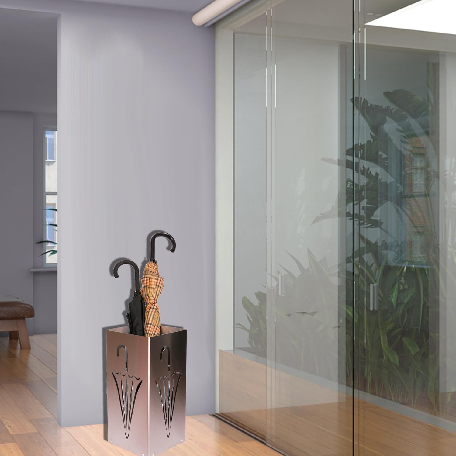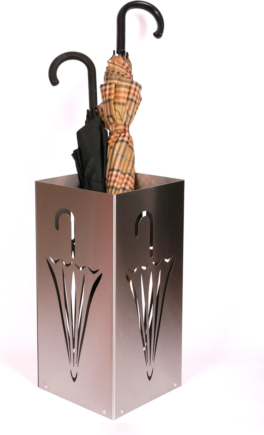 - Hochwertiger Regenschirmständer eckig aus 1 mm dickem Edelstahl gefertigt und dadurch korrosionsbeständig.