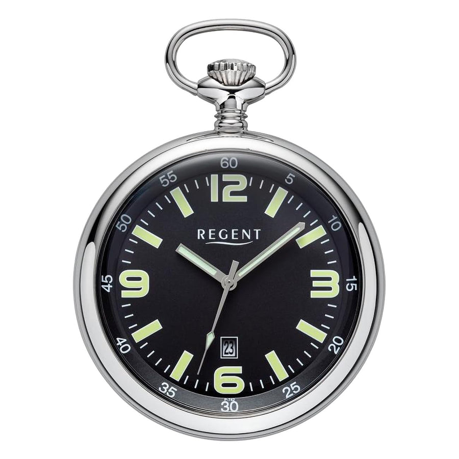 PRODUKTBESCHREIBUNGEN - Regent Quarz Taschenuhr P-742 - Gehäusedurchmesser : ca. 50 mm (ohne Krone) - Gehäusehöhe : ca. 12.4 mm - Edelstahlgehäuse, poliert - Anzeige : Silberfarbene Stunde, Minute und Sekunde zentral - Leuchtmasse auf dem Stunden- und Minutenzeiger, sowie den arabischen Zahlen und Strich Indexen - Schwarzes Zifferblatt mit grünen arabischen Zahlen und Strich Indexen - Weisse Minuteneinteilungen - Datum auf 06:00 Uhr - Gewölbtes Mineralglas - Gerändelte Edelstahl Zwiebel Krone - Krone ist auf 12:00 Uhr - Hochwertiges Miyota 2315 Quarzwerk - Batterie : 377 - Gewicht : ca. 51 Gramm - Taschenuhrenkette als Zubehör erhältlich Lieferumfang : - Regent Taschenuhr P-742 - Regent Taschenuhrenbox - Regent Servicekarte Mehr