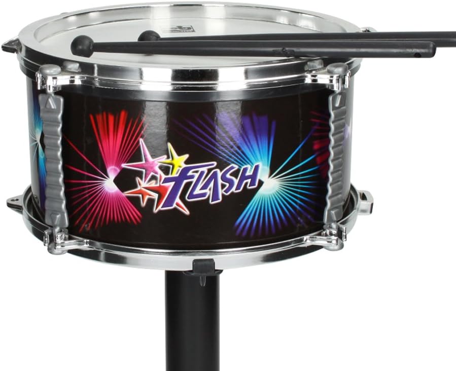 - Mit 2 Tom-Tom Trommeln, einem Bass-Drum mit Pedal, einem Side-Drum, einem Snare (alle mit metallisierten Spannreifen) und einem Becken