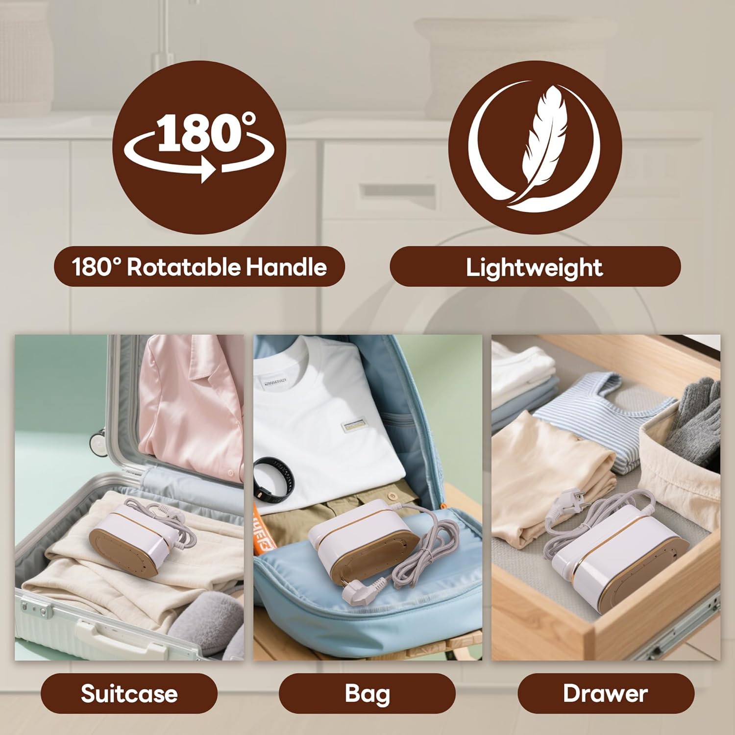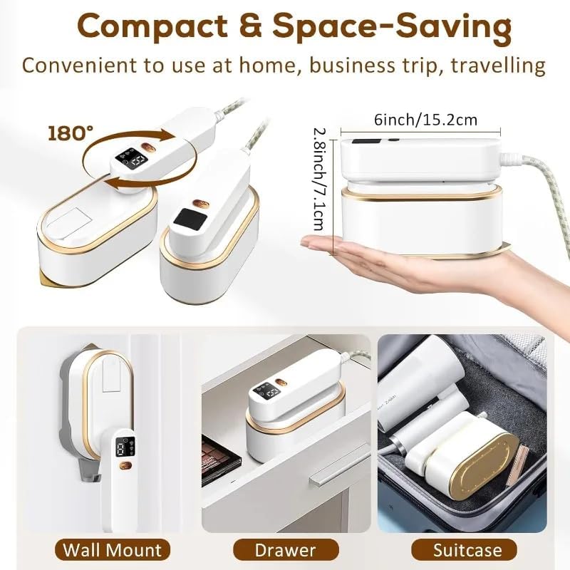 - 【Kompaktes Mini Bügeleisen】Mit 3-fach verstellbarem Griff (0°-90°-180°) vereint dieses kleine Bügeleisen Portabilität mit Funktionalität. Leicht (0,8 kg) und faltbar – optimal für Geschäftsreisen, Urlaub oder schnelle Korrekturen. Passt