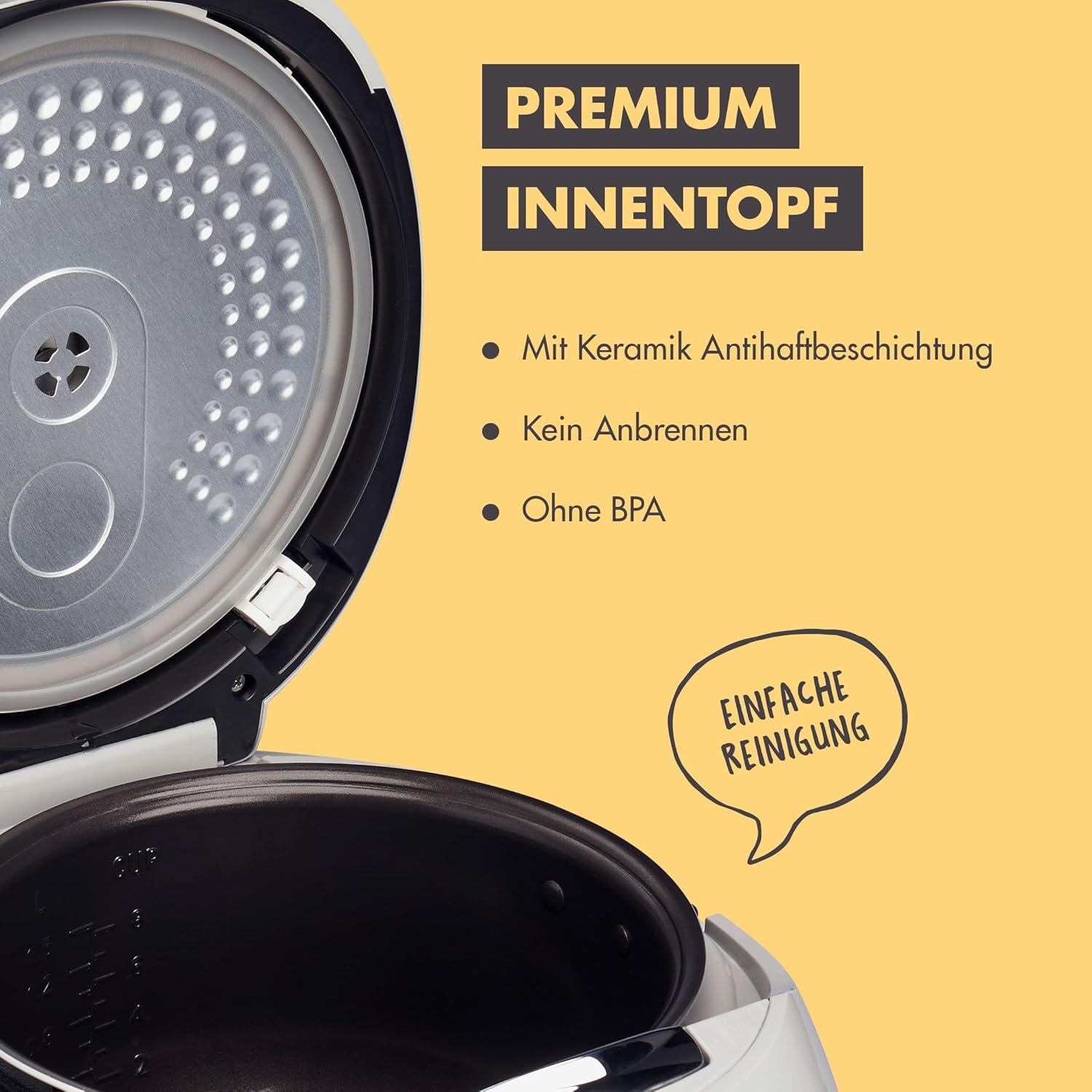- 💎 PREMIUM INNENTOPF & KEIN ANBRENNEN – Stabiler Innentopf mit praktischen Henkeln und hochwertiger Antihaftbeschichtung aus Keramik. 3D-Hitzeverteilung für gleichmässig und perfekt gegarten Reis. Spülmaschinen geeignet