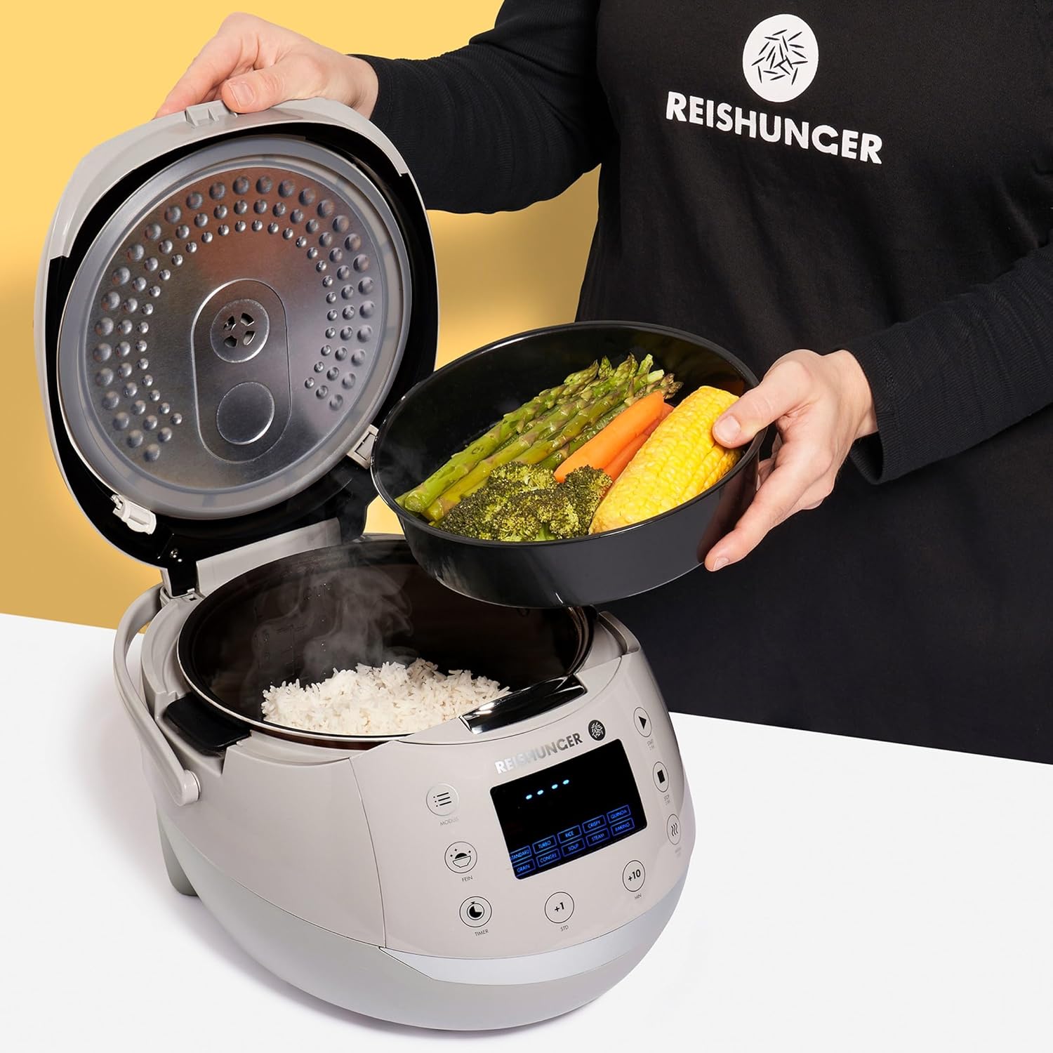 - 🙂 INTUITIVE BEDIENUNG & KOMFORTABLE NUTZUNG – Intuitive Bedienung dank einfacher Menüführung und gut beleuchtetem modernen Display. Nützliche Timer- und Warmhaltefunktion für herrlich leckeren Reis zur Wunschzeit