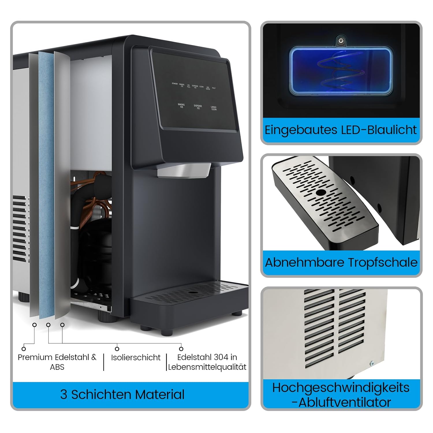 • ★ Einzigartiges Nuggeteis ★ Anders als die herkömmlichen Würfeleis und Kugeleis auf dem Markt produziert unsere Eiswürfelmaschine Nuggeteis, das direkt gekaut werden kann, knackig schmeckt und gleichzeitig Getränke schnell abkühlen kann.