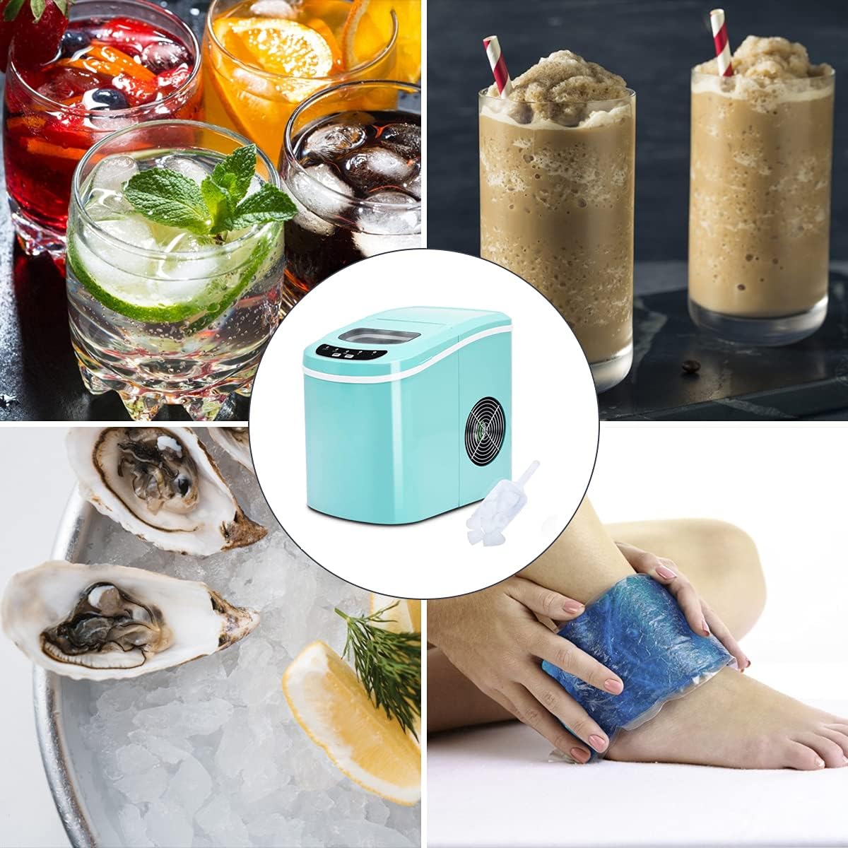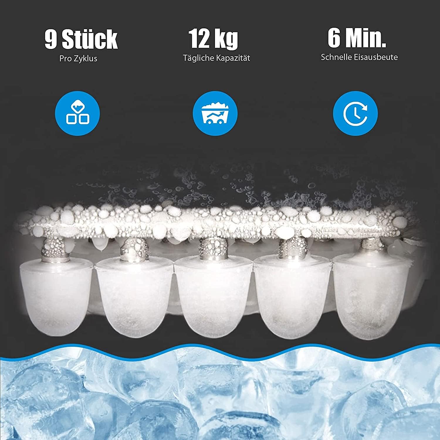 - ★ Effiziente & Leise Eisbereitung ★ Dank der starken Leistung des Eiswürfelzubereiters dauert es nur kurze 6 bis 13 Minuten, um 9 Würfel herzustellen. Der Eiswürfelzubereiter kann 12 kg Eis pro Tag herstellen und deckt damit problemlos Ihren