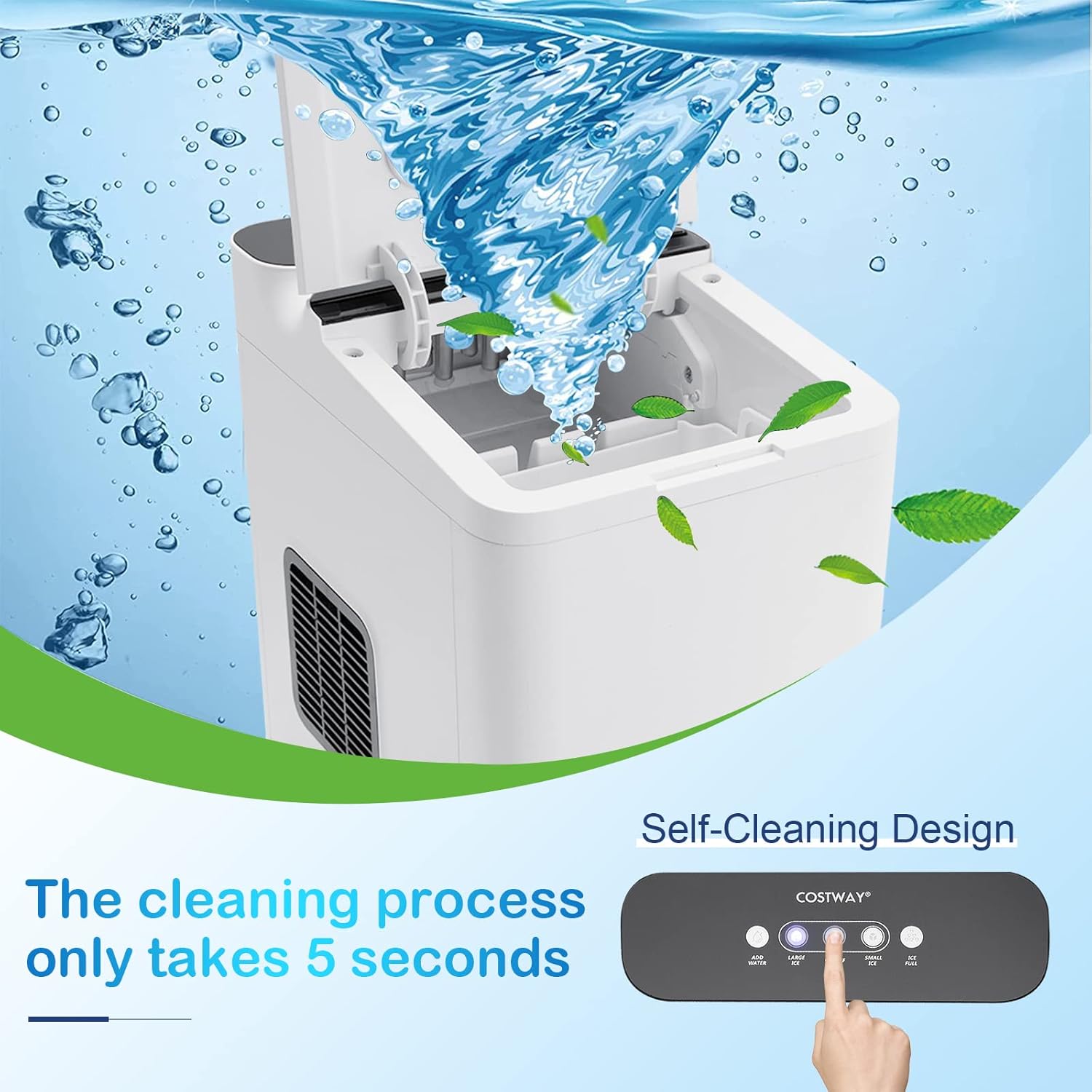 • ★ Einfache Reinigung ★ Nach dem Gebrauch können Sie die Starttaste 5 Sekunden lang gedrückt halten, um die 30-minütige Selbstreinigungsfunktion einzuschalten. Der Boden ist mit Entleerungsstopfen zum einfachen Ablassen ausgestattet. Sie müssen sich um Hygieneprobleme sorgen, die durch schlecht gereinigte Eismaschine verursacht werden.