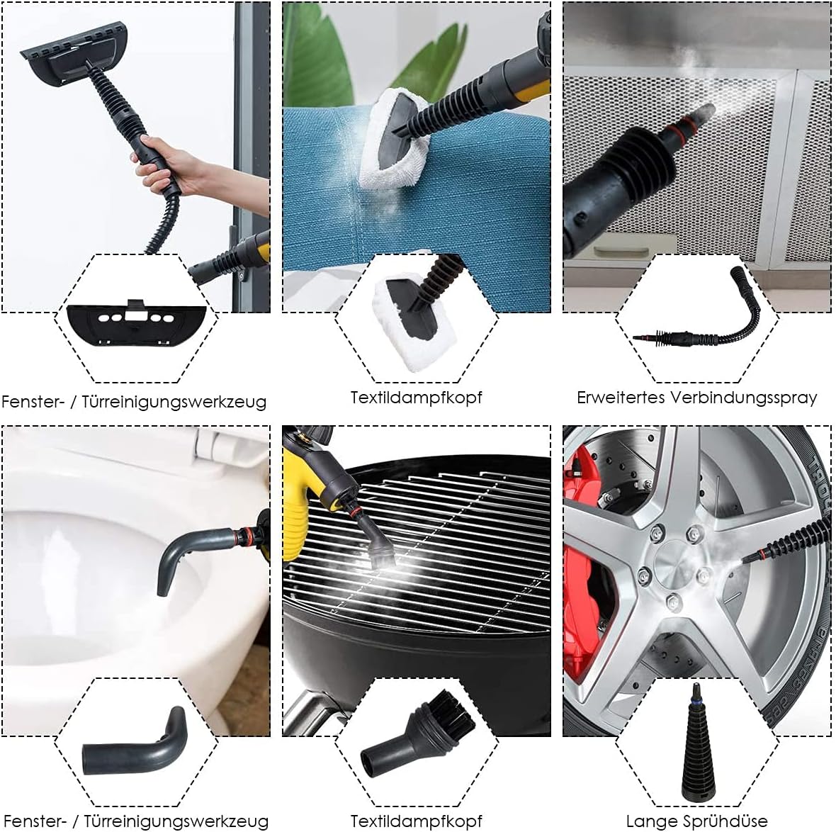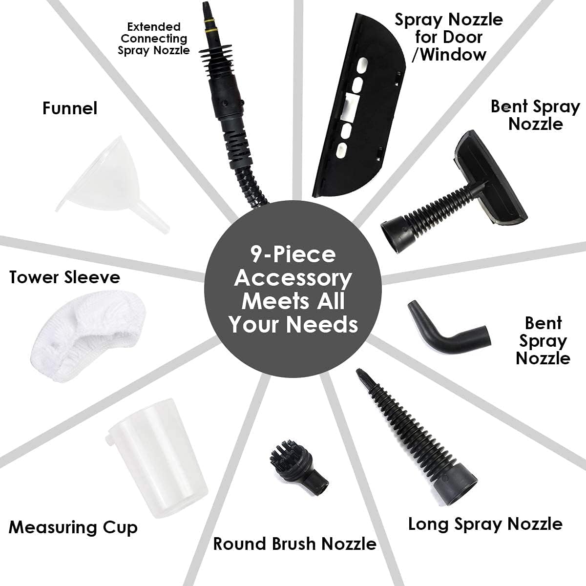 - ★ Eine Vielzahl von Zubehör ★ Dieser Dampfreiniger verfügt über ein 9-teiliges Zubehör-Set. Sie können das Zubehör nach Wunsch austauschen. Mit diesem kann dieser Dampfreiniger verschiedene Anforderungen erfüllen, um eine gründliche Reinigung zu gewährleisten.