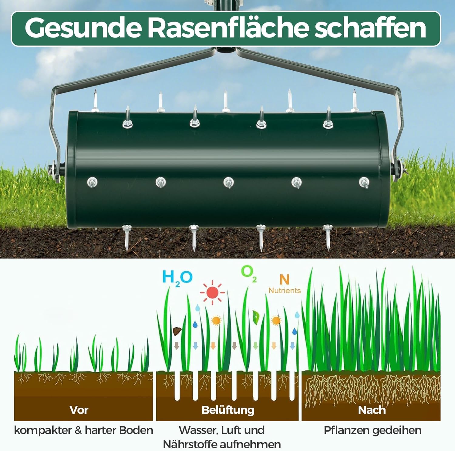 - ★ Befüllbare Trommel ★ Die Trommel des Rasenlüfters ist so konzipiert, dass sie sich öffnen lässt, um Sand oder Steine hinzuzufügen, damit die Pflöcke besser eindringen können. Dieses clevere Design ermöglicht eine massgeschneiderte