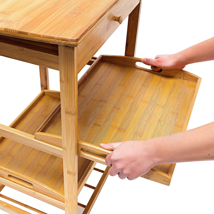 - Der mobile Küchenrollwagen aus Bambus mit einem praktischen Weinregal bzw. Flaschenregal, 2 Tabletts zum Entnehmen und 1 Schublade - Tabletts bspw. für das Frühstück nutzen und Zeit einsparen