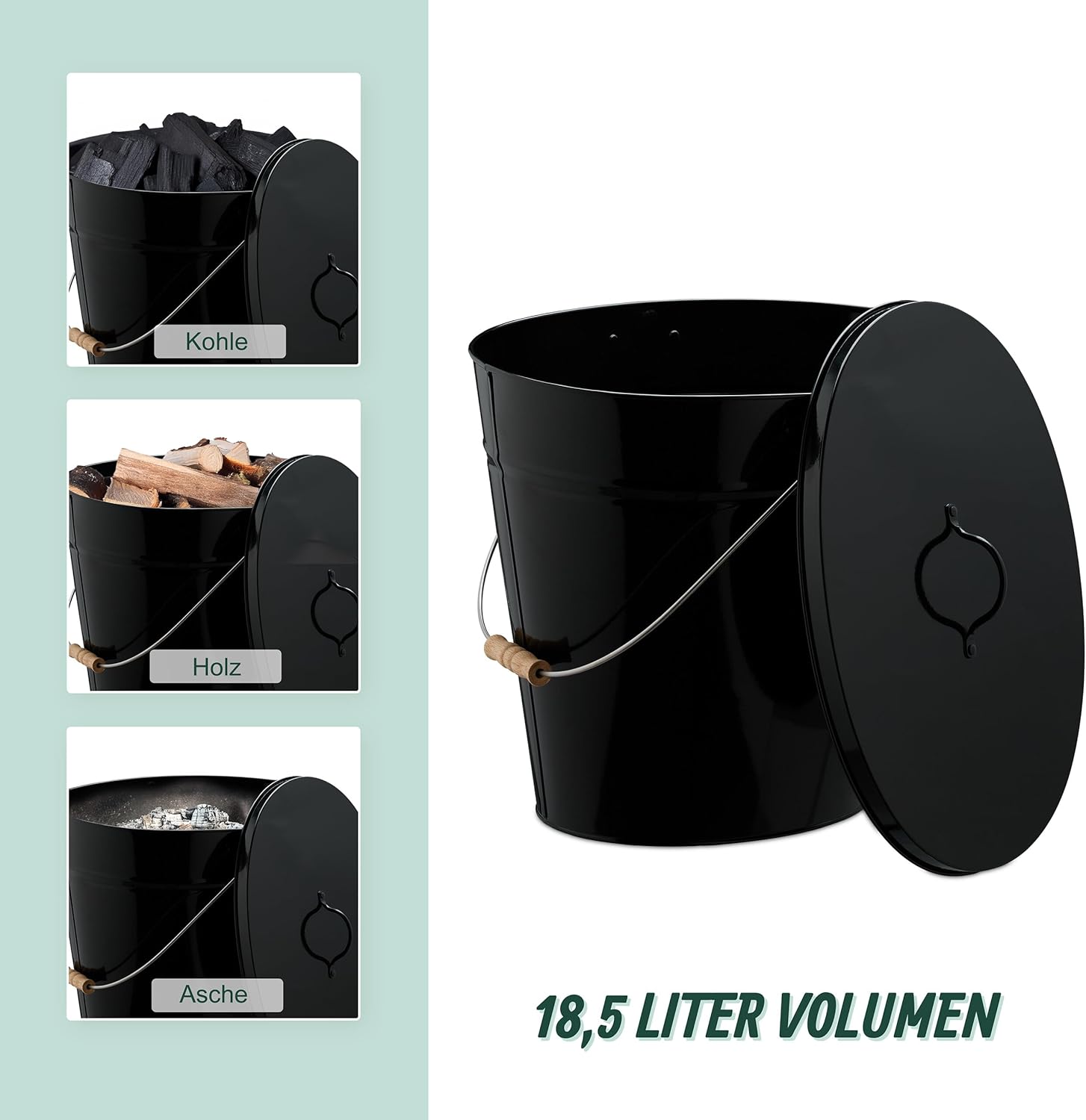 Relaxdays Ascheeimer mit Deckel, 18,5 Liter, Henkel mit Holzgriff, für Kohle & Asche, Kamin, Stahl A