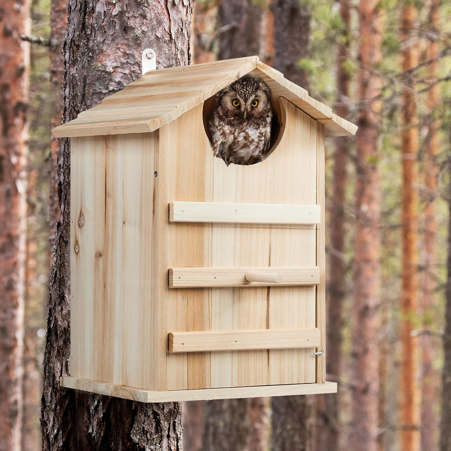 - Nisthilfe: Der Nistkasten ist für kleinere Eulenarten wie Steinkauz oder Raufusskauz bestens geeignet