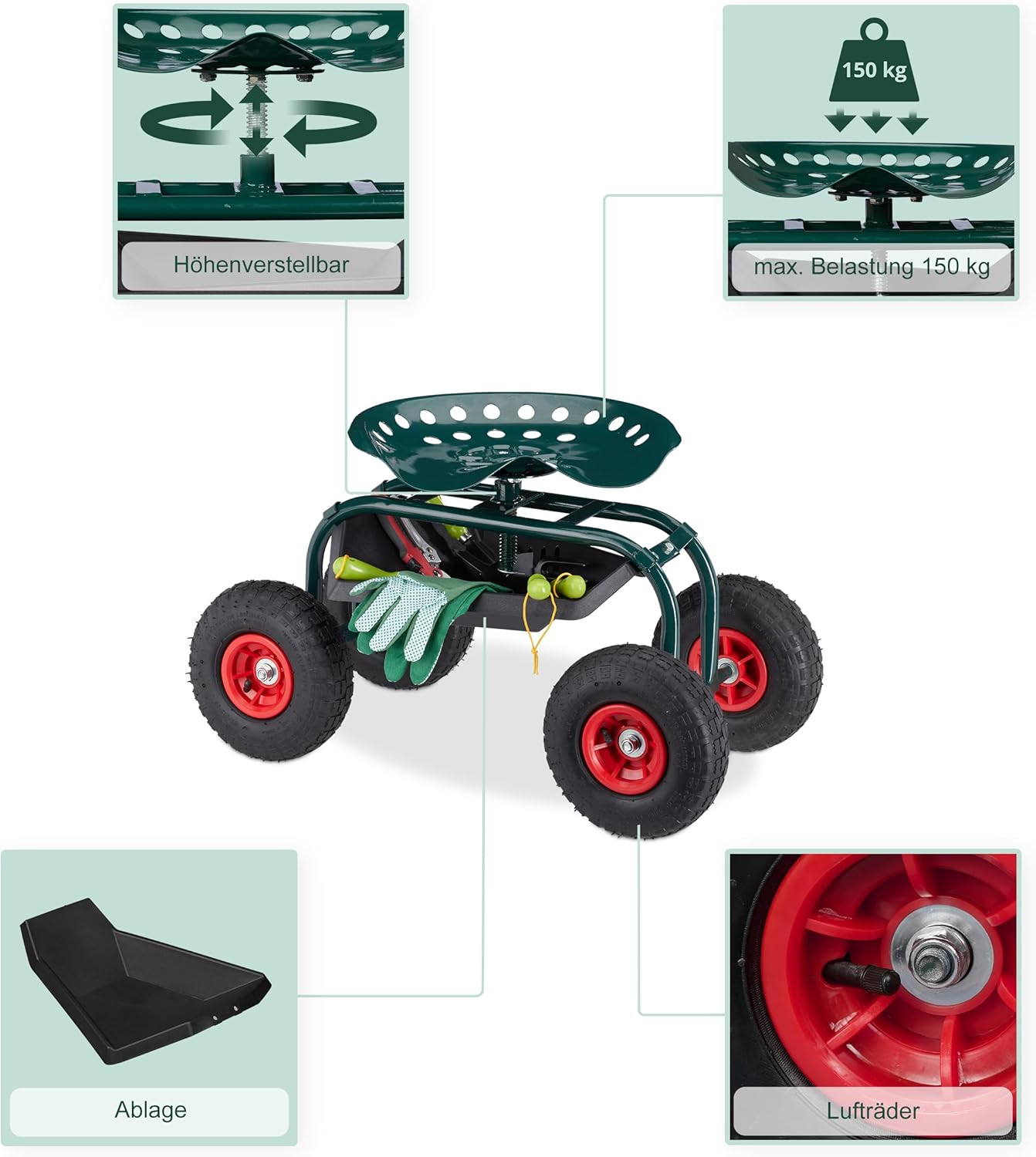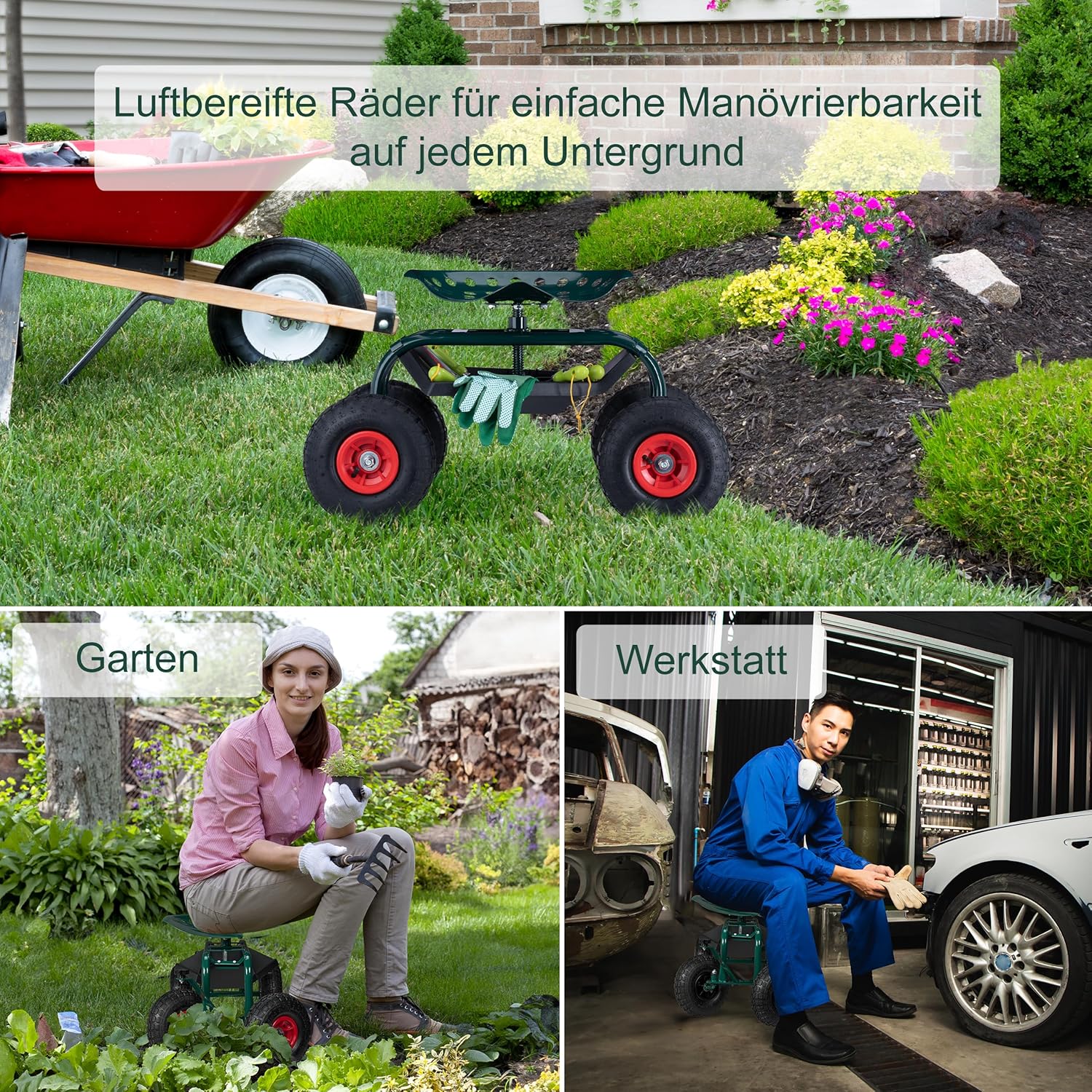 - Mit Rollen: Fahrbarer Gartensitz mit 4 leichtgängigen Lufträdern - Lässt sich einfach verschieben