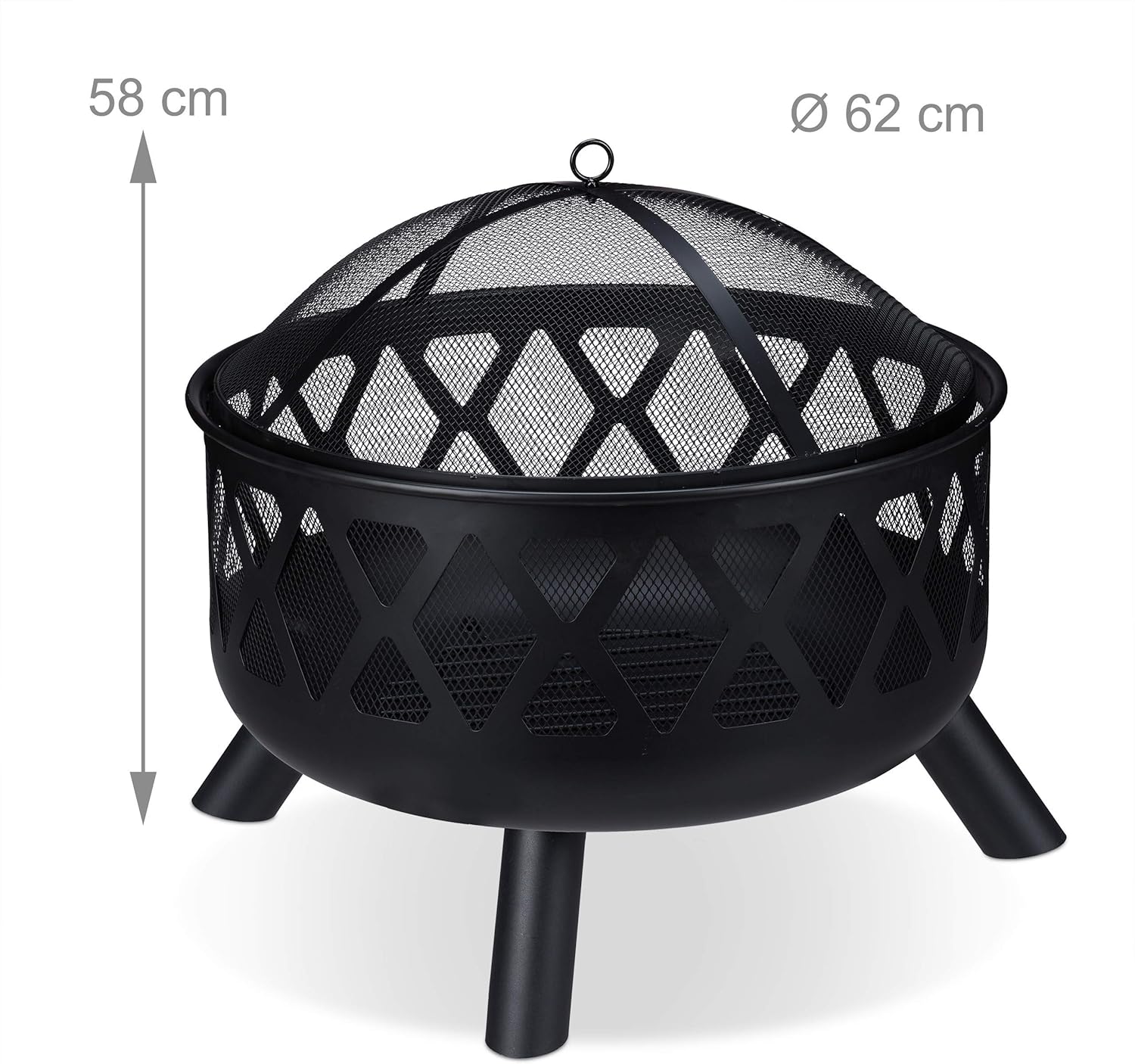 Relaxdays Feuerschale mit Funkenschutz, Ø 62 cm, mit Schürhaken, Garten, Terrasse, Outdoor Feuerstel