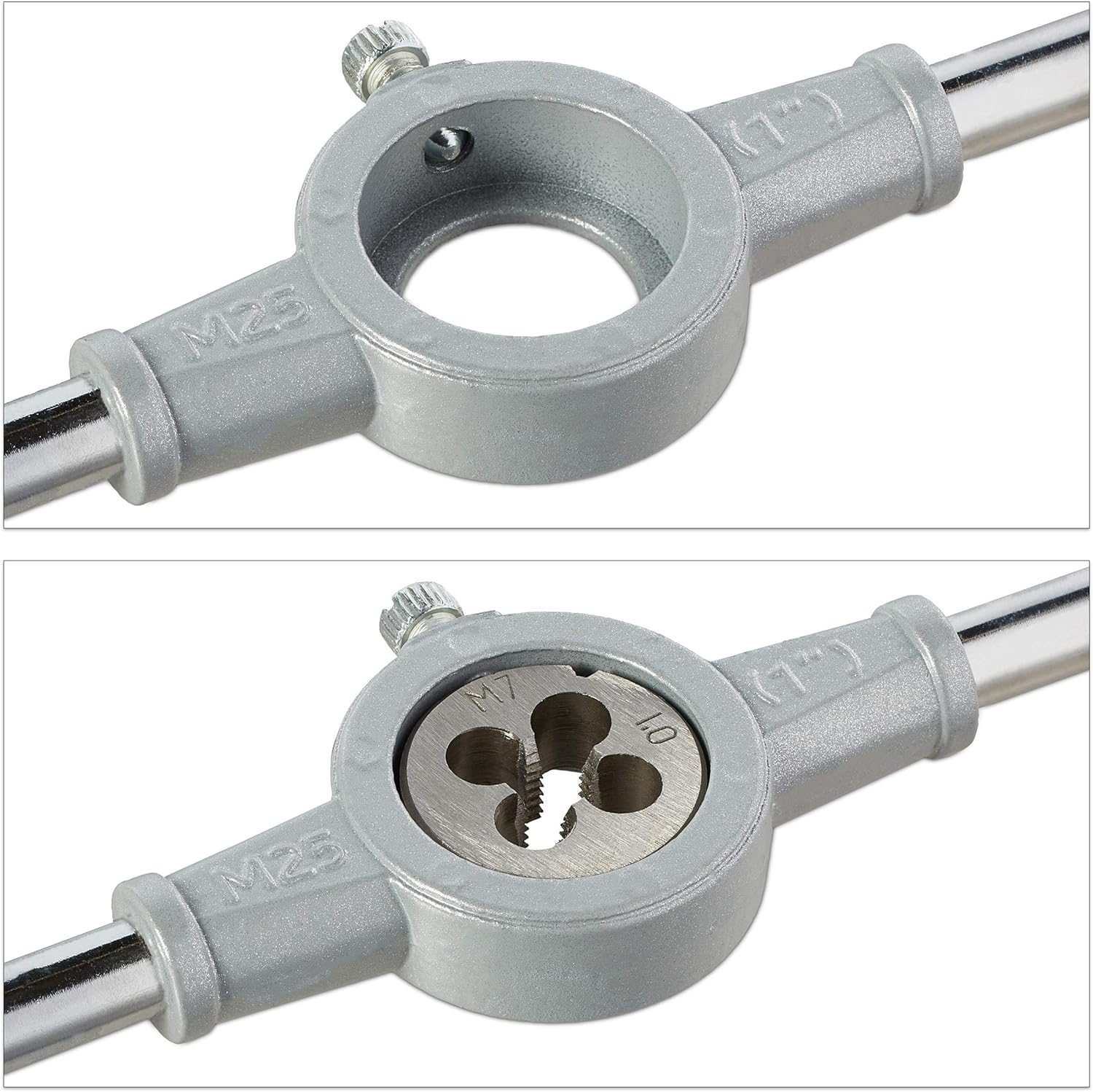 - Set: Enthält 9 Schneideisen, 9 Gewindebohrer, Windeisen, Gewindelehre, Schneideisenhalter und Koffer