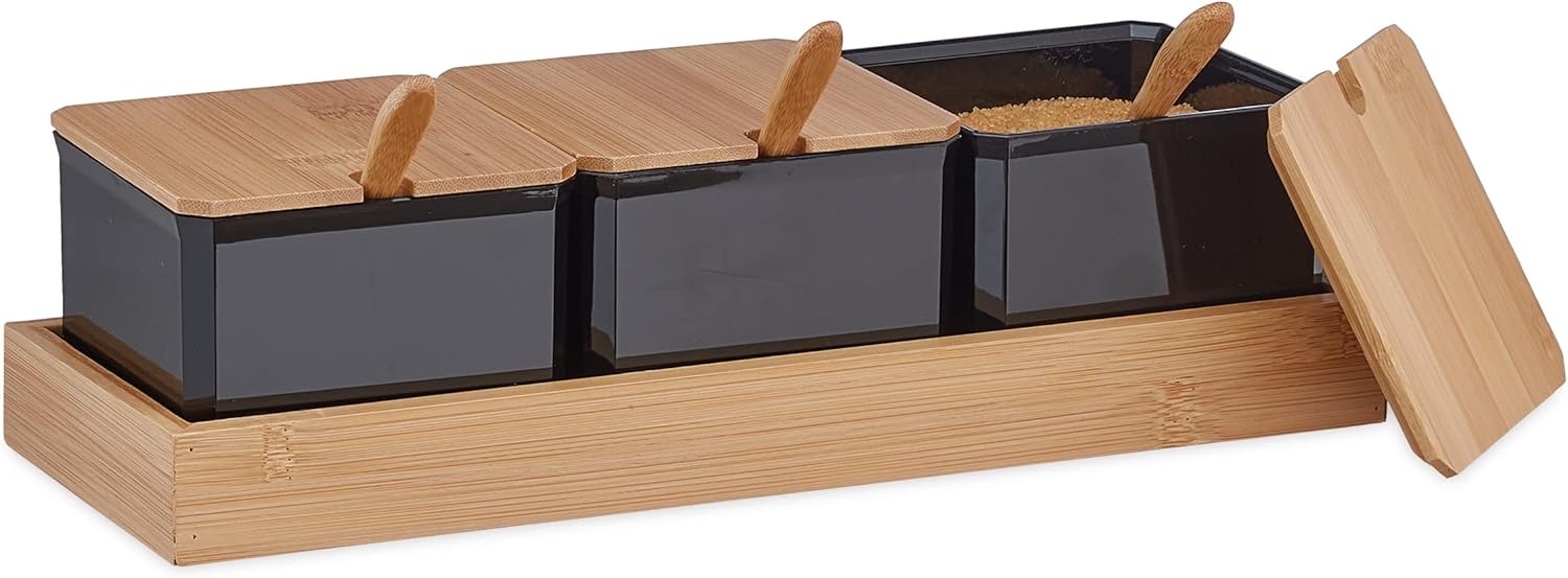 - Robust: Gewürzdosen aus schwarzem Kunststoff - Deckel, Löffel und Tablett aus natürlichem Bambus