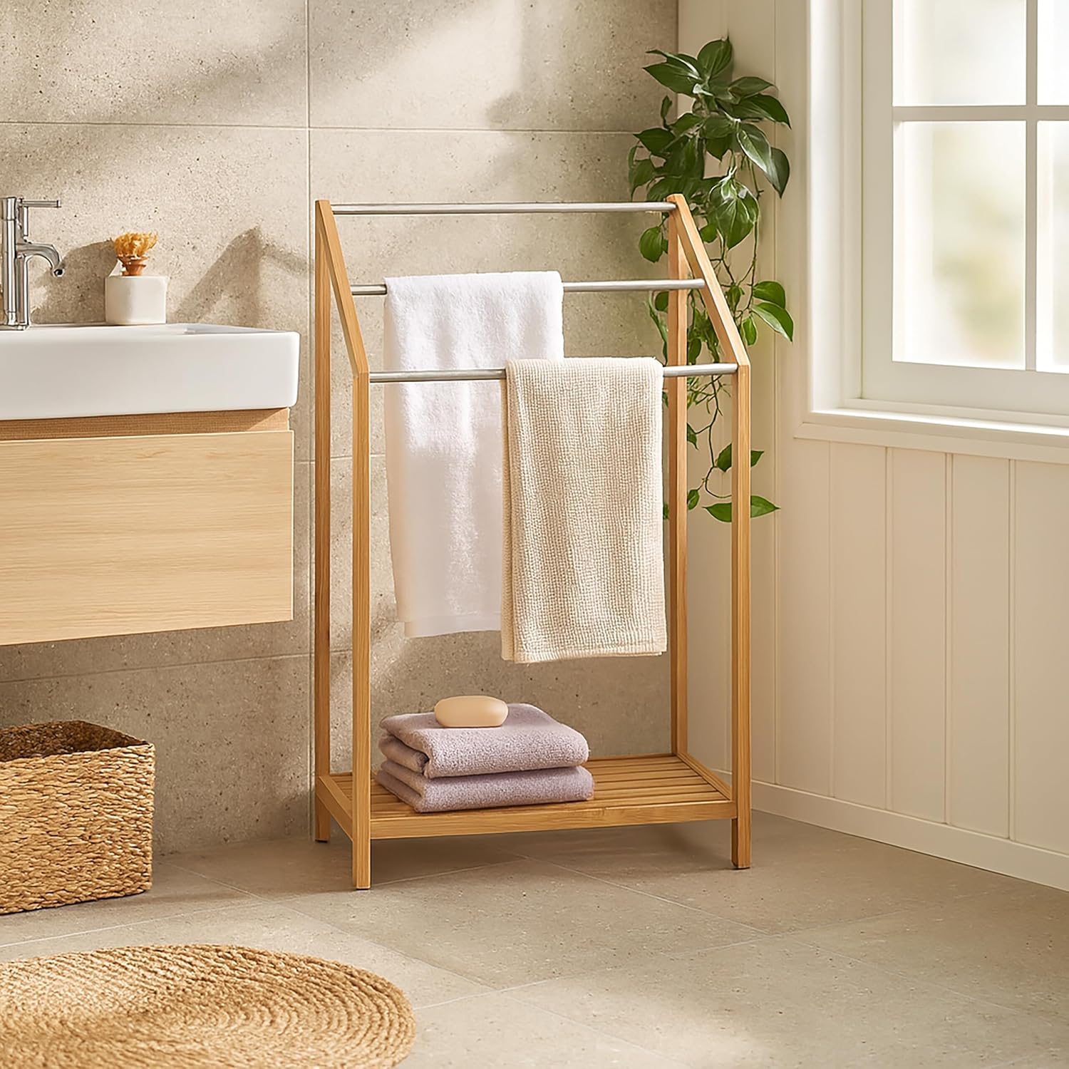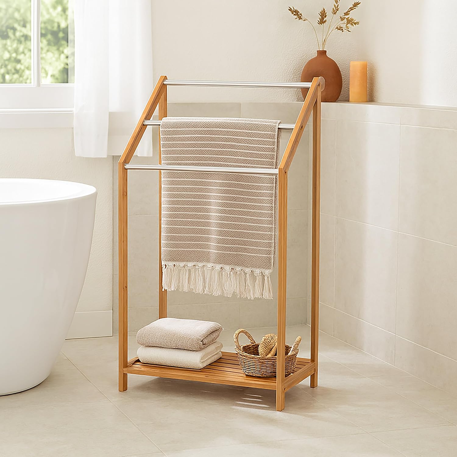 - Freistehend: Handtuchhalter mit 3 nebeneinander aufsteigenden Handtuchstangen - Niedrigste Stange hängt 58 cm hoch