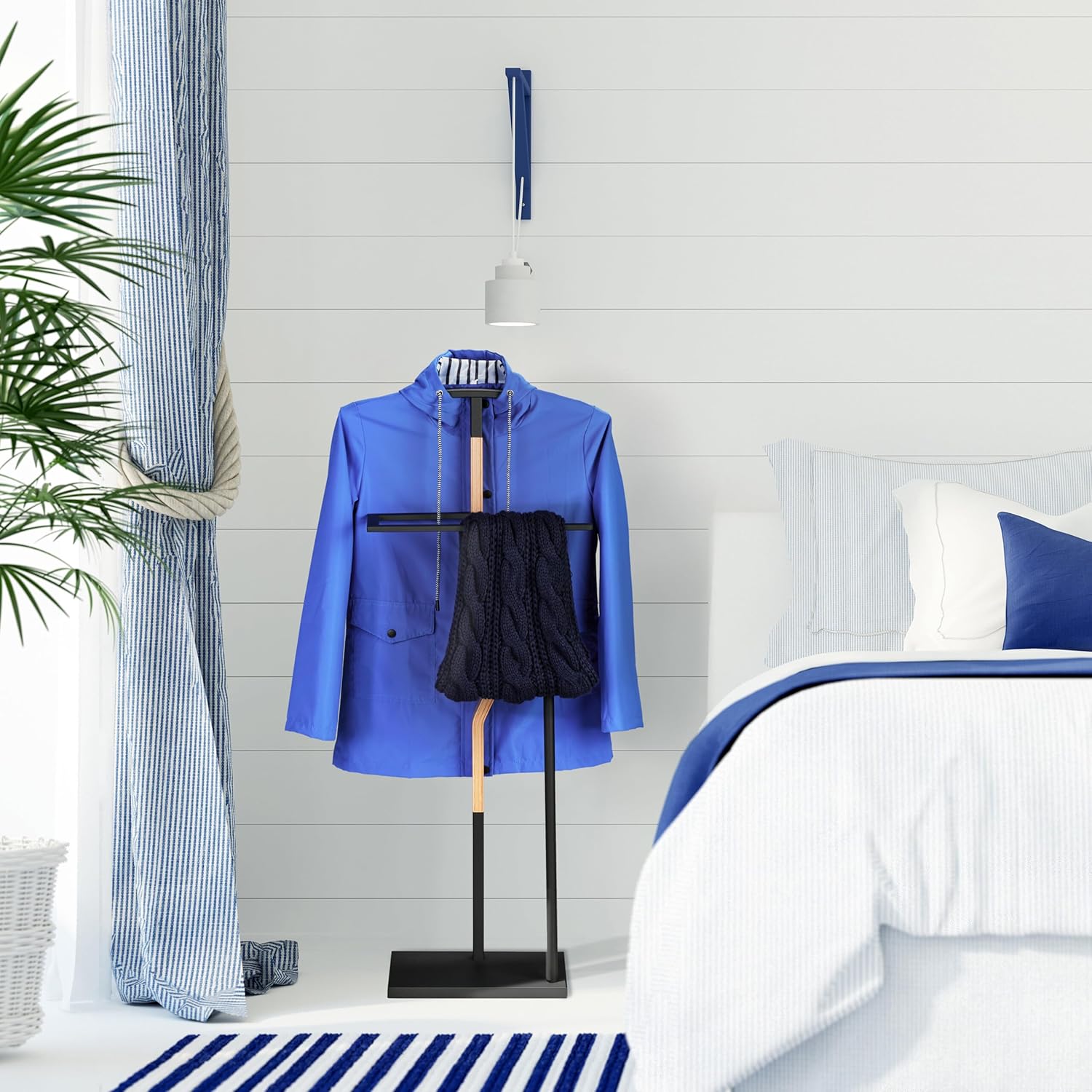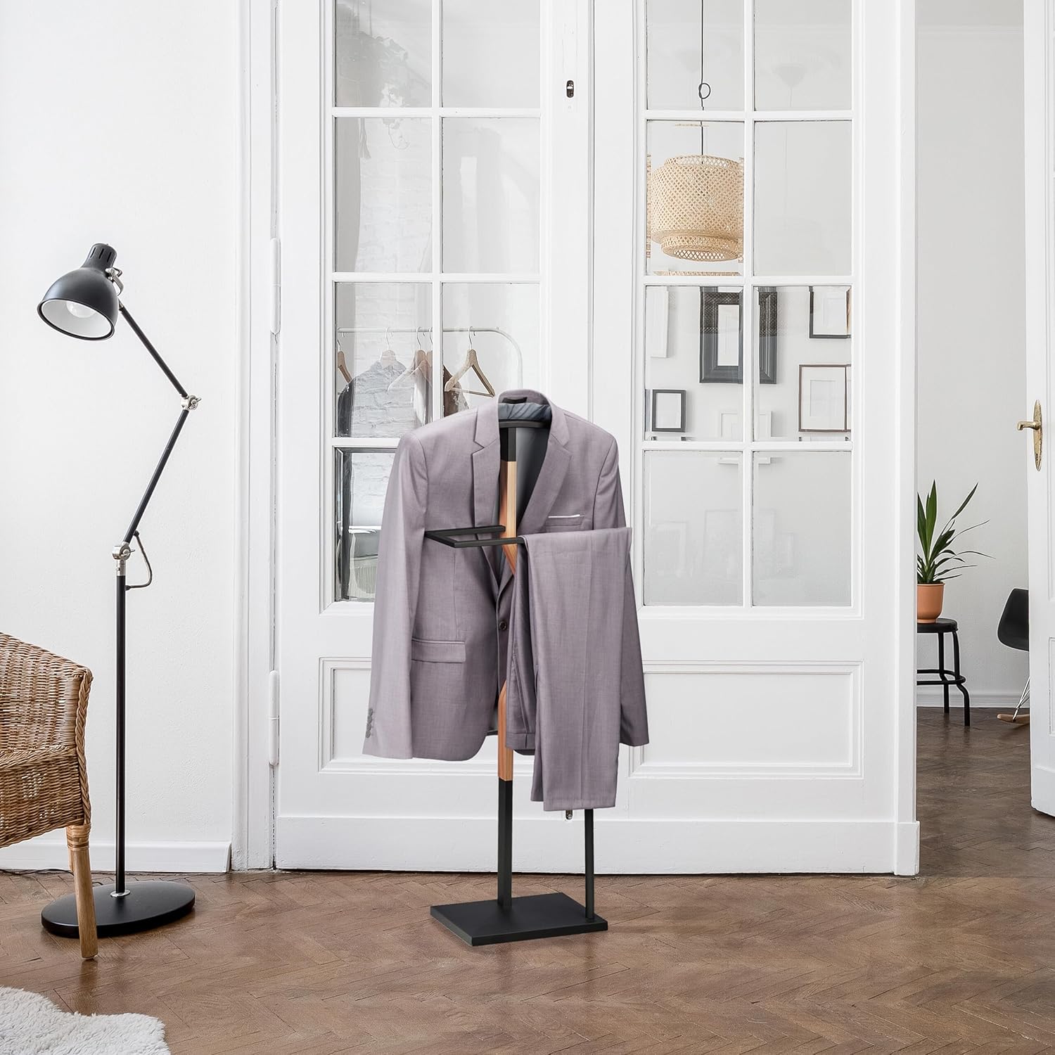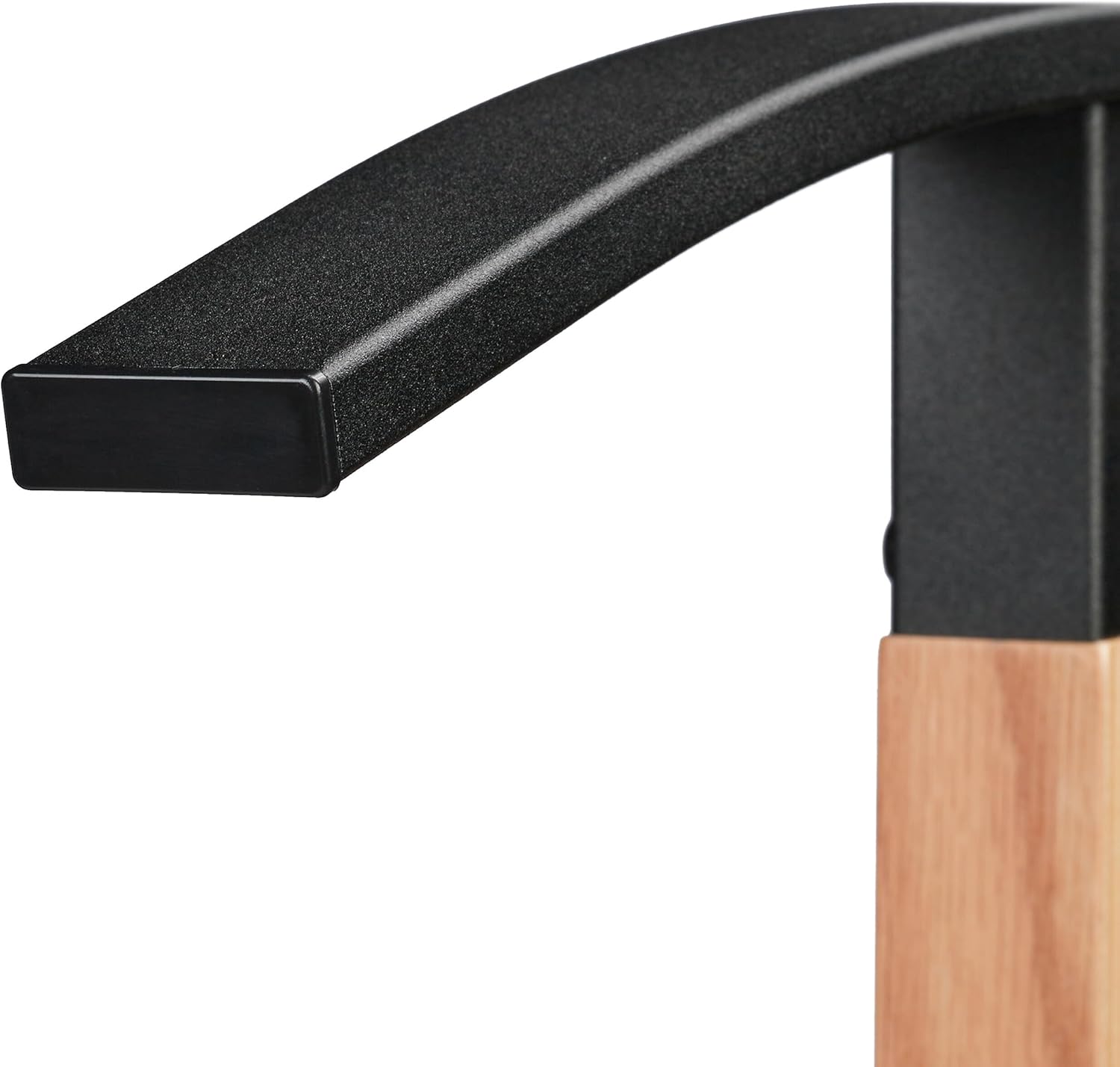 - Materialmix: Eleganter Kleiderbutler aus schwarzem Stahl u. geknicktem Bein in natürlicher Holzoptik