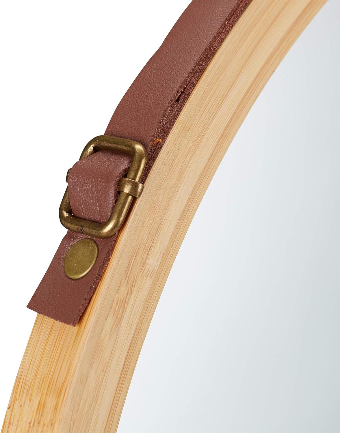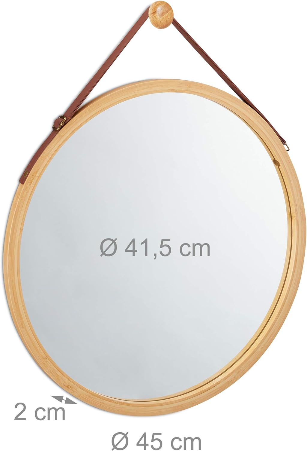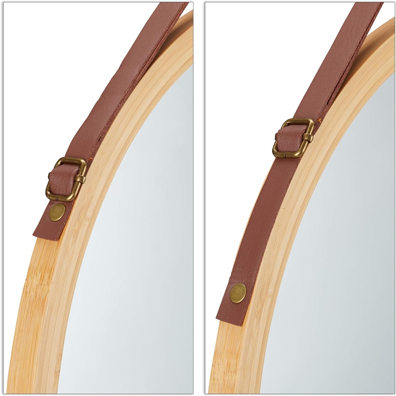Relaxdays Wandmontage Hängespiegel rund, verstellbarer Riemen, Rahmen aus Bambus, modern, Flur, Bad