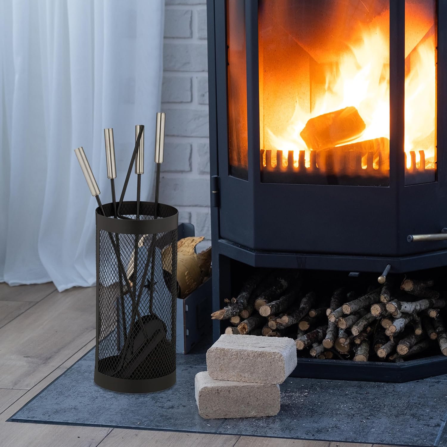 - 5-teilig: Kaminbesteck Set mit Aschebesen, Kaminschaufel, Feuerhaken, Zange u. Eimer zum Reinstellen