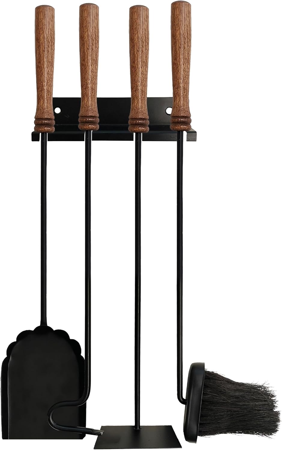- Design: Schwarzes Ofenzubehör mit Holzgriffen - Kamingarnitur mit Halter zur praktischen Wandmontage