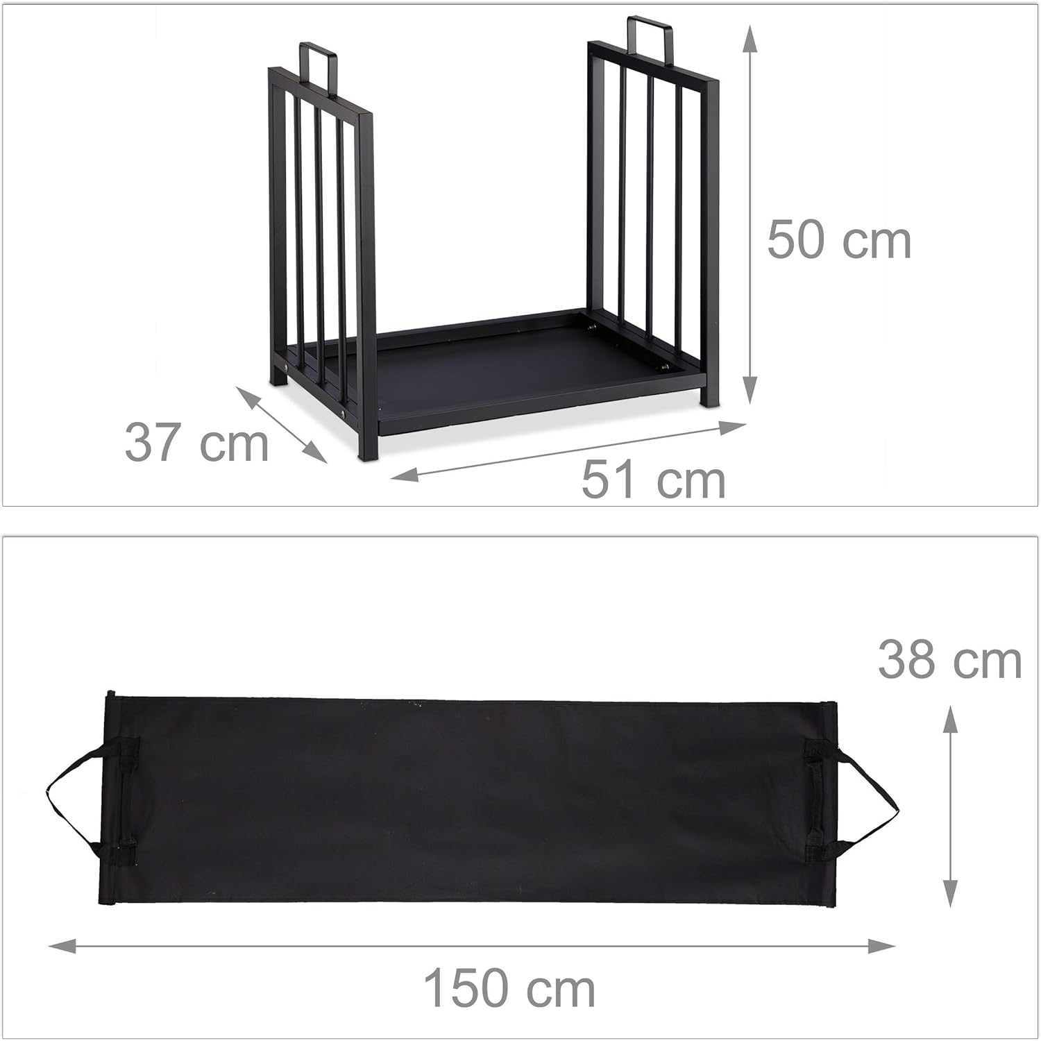 Relaxdays Kaminholzständer mit Holztragetasche, für innen, modernes Design, Kaminregal Stahl, HBT: 5