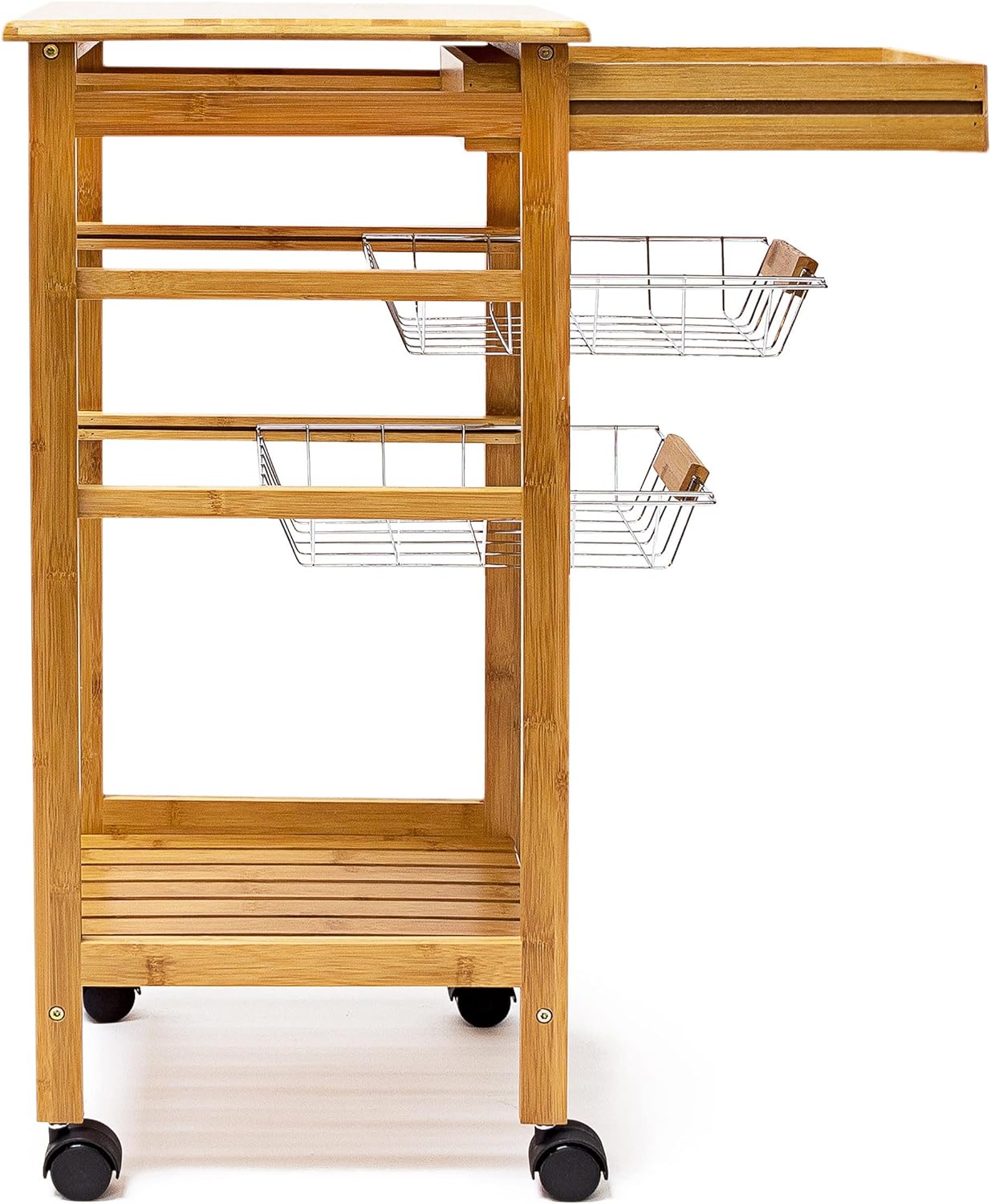 - Der mobile Küchenrollwagen aus Bambus mit 2 praktischen Ablagen, 2 Metallgitter-Körben, (Masse der Körbe: ca. 5 x 28 x 29 cm) zum Entnehmen und 1 Schublade für Besteck, Flaschenöffner, Sparschäler uvm
