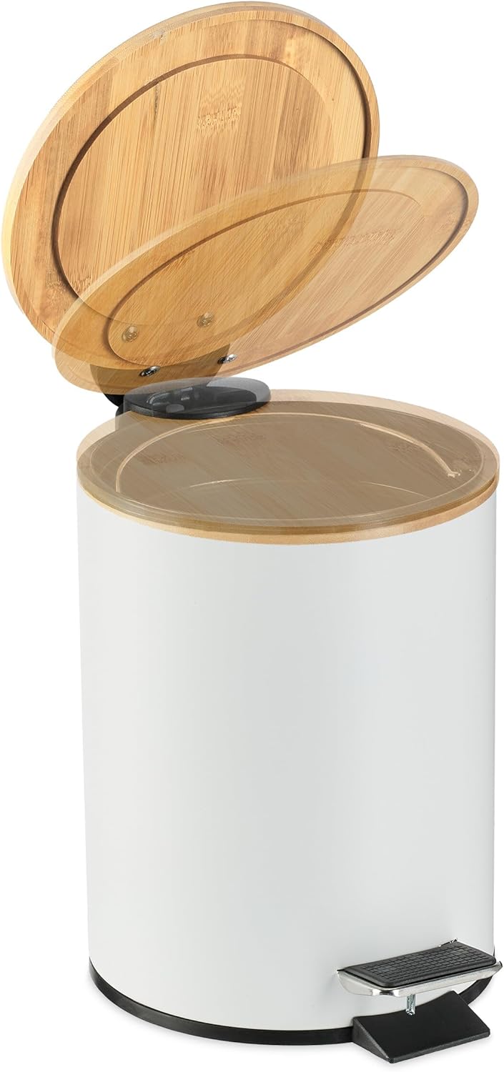 - Design: Kosmetikmülleimer aus Metall in mattem Weiss - Deckel aus Bambus setzt natürliche Akzente
