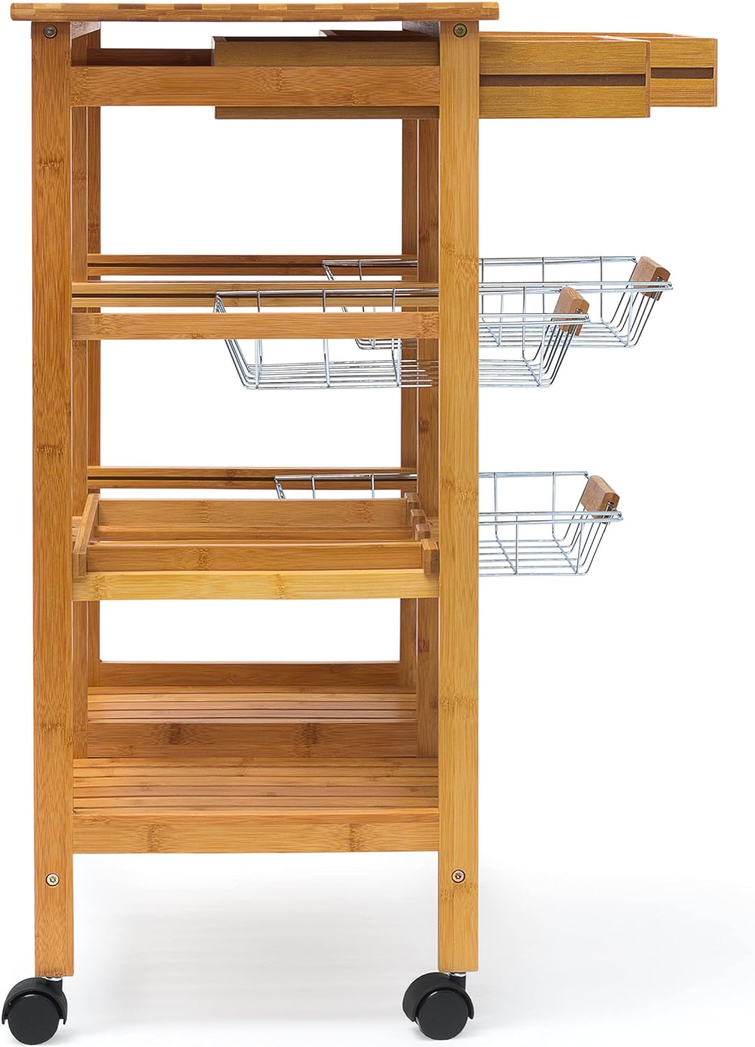 • Der mobile Küchenrollwagen aus Bambus mit einem praktischen Weinregal bzw. Flaschenregal für 3 Flaschen, 3 Metallgitter-Körbe (Masse der Körbe: ca. 6 x 28 x 30 cm) zum Entnehmen und 2 Schubladen