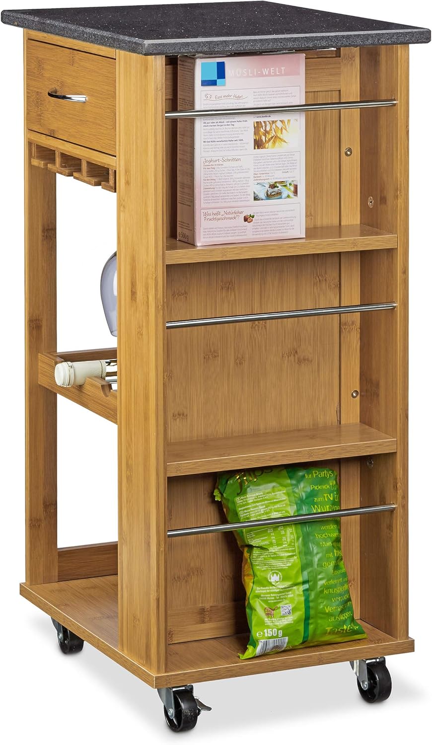 - Küchenrollwagen mit Schublade samt Auszugsstopp (Innenmasse HBT: 10 x 27,5 x 27,5 cm) - Gläserhalter mit 3 Einschüben für je 4-5 Gläser - Weinflaschenhalter für 3 Flaschen (waagerechte Lagerung)