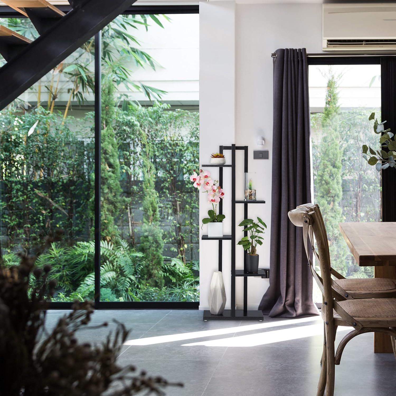 - Materialmix: Stilvolle Pflanzentreppe mit schwarzem Metallgestell und Ablagen in schwarzer Holzoptik