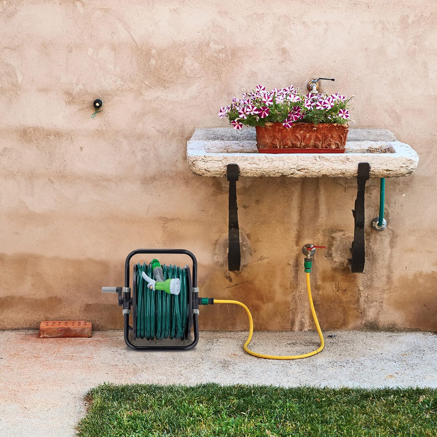 - Stabil: Schlauchwickler mit Handkurbel steht dank dreieckiger Konstruktion auch beim Giessen sicher