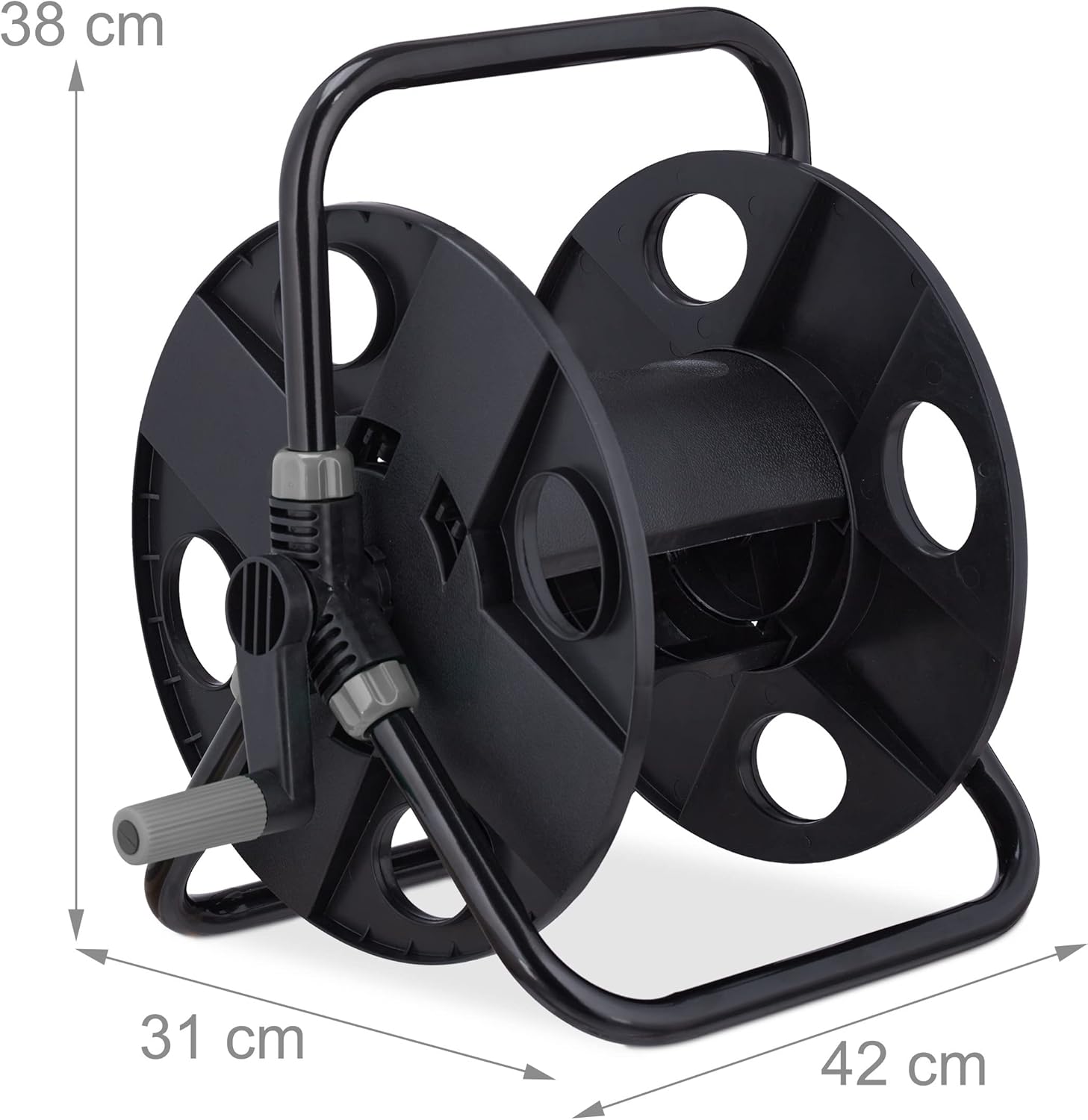 - Details: Schlauchaufroller aus Kunststoff und Stahl - HxBxT: ca. 38 x 42 x 31 cm - Ohne Schlauch